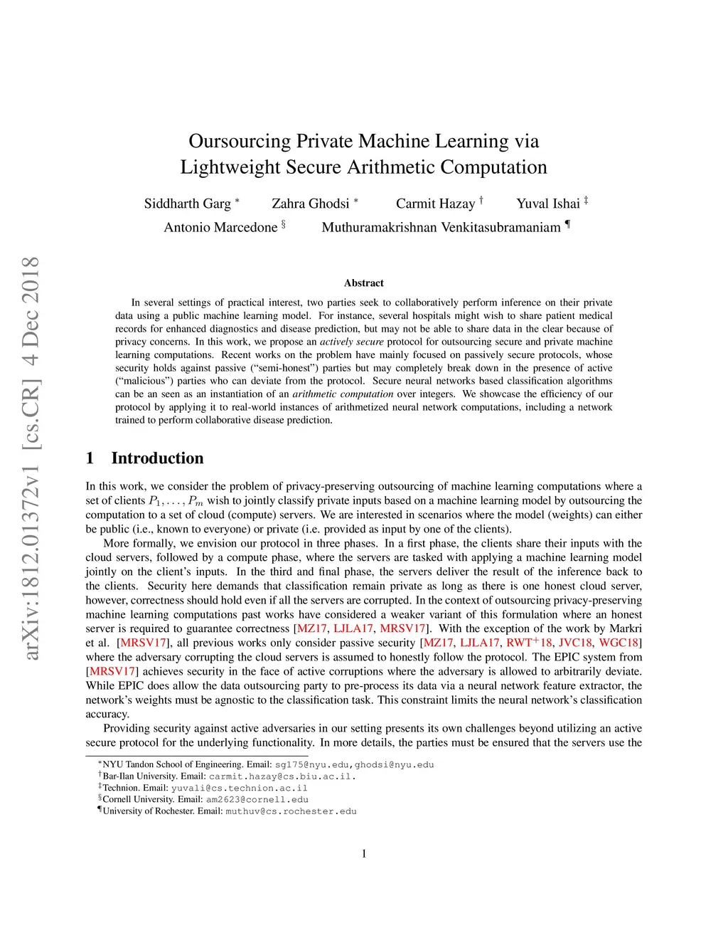 Outsourcing Private Machine Learning via Lightweight Secure Arithmetic