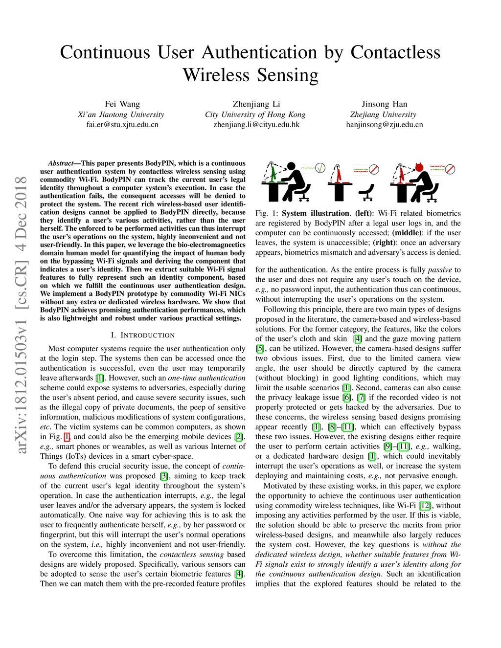 This paper presents BodyPIN, which is a continuous user authentication system by contactless wireless sensing using commodity Wi-Fi. BodyPIN can track the current user's legal identity throughout a computer system's execution. In case the authentication fails, the consequent accesses will be denied to protect the system. The recent rich wireless-based user identification designs cannot be applied to BodyPIN directly, because they identify a user's various activities, rather than the user herself. The enforced to be performed activities can thus interrupt the user's operations on the system, highly inconvenient and not user-friendly. In this paper, we leverage the bio-electromagnetics domain human model for quantifying the impact of human body on the bypassing Wi-Fi signals and deriving the component that indicates a user's identity. Then we extract suitable Wi-Fi signal features to fully represent such an identity component, based on which we fulfill the continuous user authentication design. We implement a BodyPIN prototype by commodity Wi-Fi NICs without any extra or dedicated wireless hardware. We show that BodyPIN achieves promising authentication performances, which is also lightweight and robust under various practical settings.