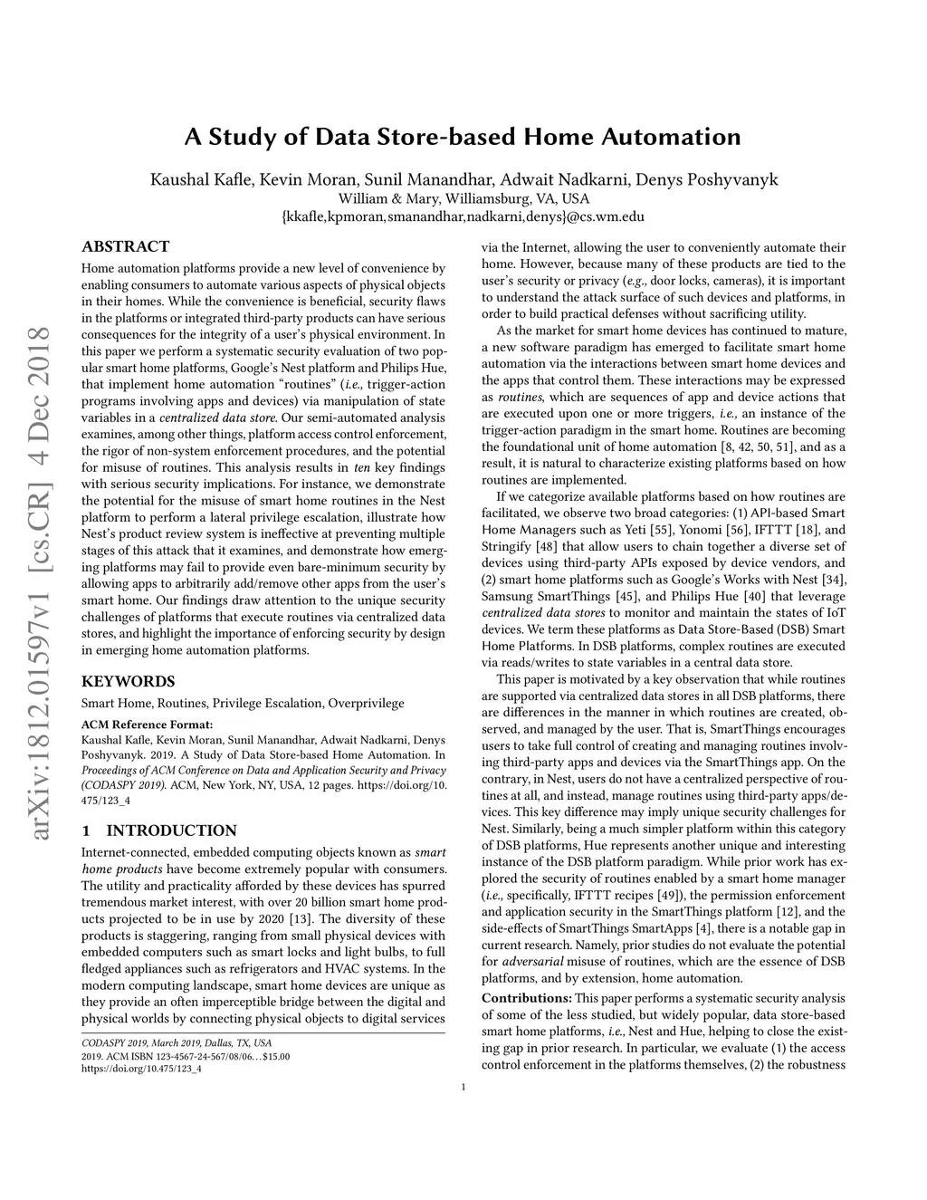 Home automation platforms provide a new level of convenience by enabling consumers to automate various aspects of physical objects in their homes. While the convenience is beneficial, security flaws in the platforms or integrated third-party products can have serious consequences for the integrity of a user's physical environment. In this paper we perform a systematic security evaluation of two popular smart home platforms, Google's Nest platform and Philips Hue, that implement home automation "routines" (i.e., trigger-action programs involving apps and devices) via manipulation of state variables in a centralized data store. Our semi-automated analysis examines, among other things, platform access control enforcement, the rigor of non-system enforcement procedures, and the potential for misuse of routines. This analysis results in ten key findings with serious security implications. For instance, we demonstrate the potential for the misuse of smart home routines in the Nest platform to perform a lateral privilege escalation, illustrate how Nest's product review system is ineffective at preventing multiple stages of this attack that it examines, and demonstrate how emerging platforms may fail to provide even bare-minimum security by allowing apps to arbitrarily add/remove other apps from the user's smart home. Our findings draw attention to the unique security challenges of platforms that execute routines via centralized data stores and highlight the importance of enforcing security by design in emerging home automation platforms.