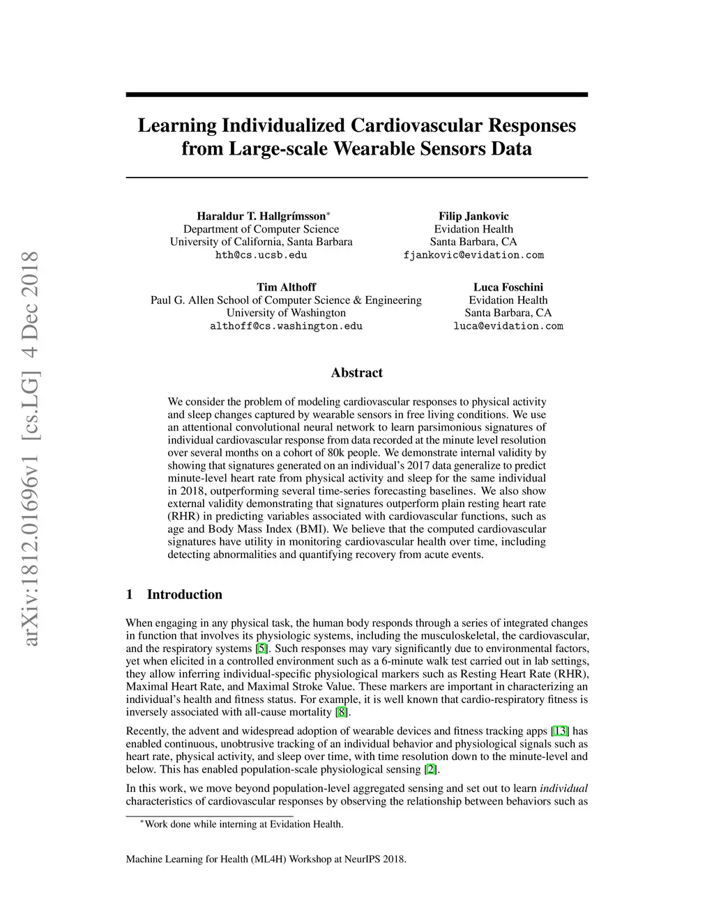 We consider the problem of modeling cardiovascular responses to physical activity and sleep changes captured by wearable sensors in free living conditions. We use an attentional convolutional neural network to learn parsimonious signatures of individual cardiovascular response from data recorded at the minute level resolution over several months on a cohort of 80k people. We demonstrate internal validity by showing that signatures generated on an individual's 2017 data generalize to predict minute-level heart rate from physical activity and sleep for the same individual in 2018, outperforming several time-series forecasting baselines. We also show external validity demonstrating that signatures outperform plain resting heart rate (RHR) in predicting variables associated with cardiovascular functions, such as age and Body Mass Index (BMI). We believe that the computed cardiovascular signatures have utility in monitoring cardiovascular health over time, including detecting abnormalities and quantifying recovery from acute events.