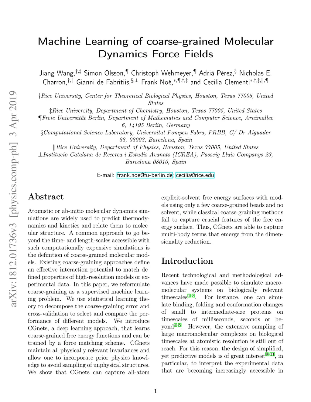 Atomistic or ab-initio molecular dynamics simulations are widely used to predict thermodynamics and kinetics and relate them to molecular structure. A common approach to go beyond the time- and length-scales accessible with such computationally expensive simulations is the definition of coarse-grained molecular models. Existing coarse-graining approaches define an effective interaction potential to match defined properties of high-resolution models or experimental data. In this paper, we reformulate coarse-graining as a supervised machine learning problem. We use statistical learning theory to decompose the coarse-graining error and cross-validation to select and compare the performance of different models. We introduce CGnets, a deep learning approach, that learns coarse-grained free energy functions and can be trained by a force matching scheme. CGnets maintain all physically relevant invariances and allow one to incorporate prior physics knowledge to avoid sampling of unphysical structures. We show that CGnets can capture all-atom explicit-solvent free energy surfaces with models using only a few coarse-grained beads and no solvent, while classical coarse-graining methods fail to capture crucial features of the free energy surface. Thus, CGnets are able to capture multi-body terms that emerge from the dimensionality reduction.