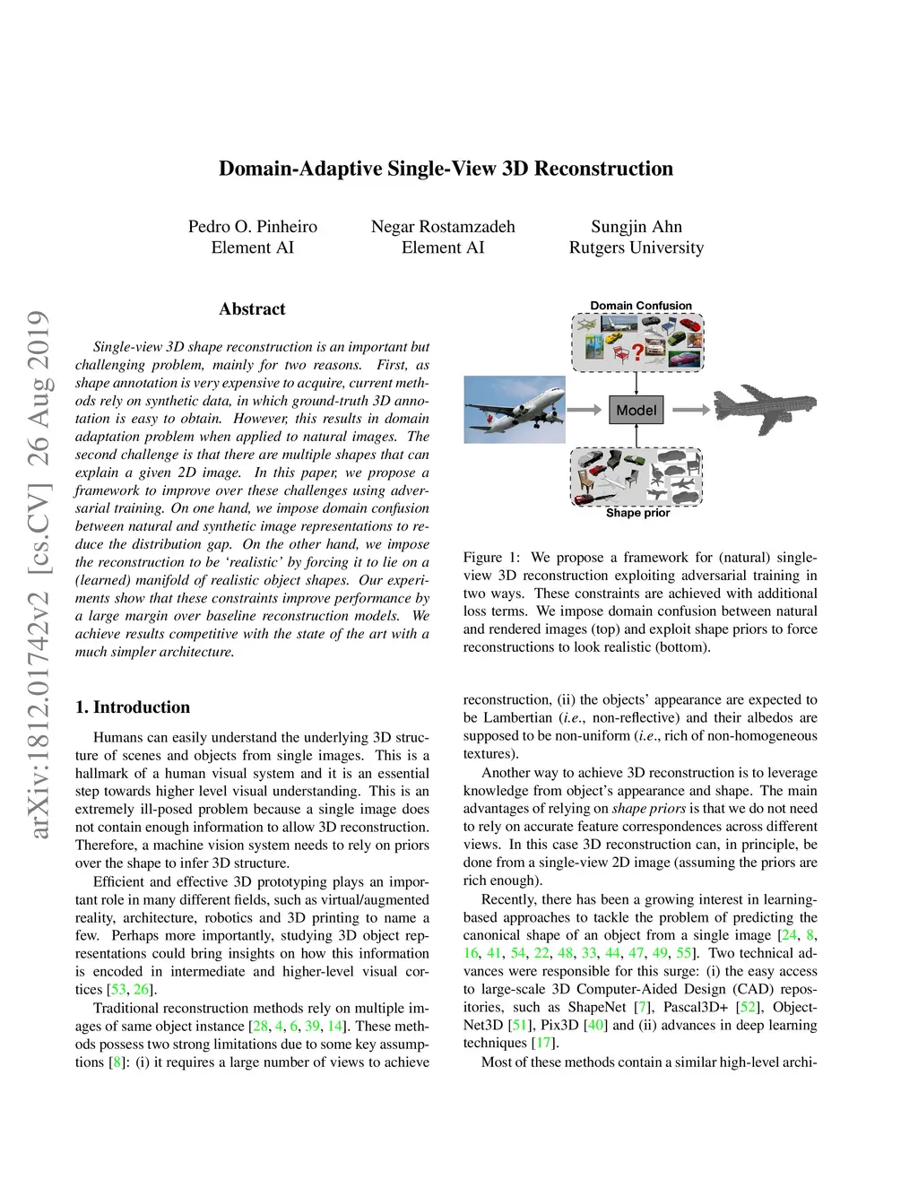 Single-view 3D shape reconstruction is an important but challenging problem, mainly for two reasons. First, as shape annotation is very expensive to acquire, current methods rely on synthetic data, in which ground-truth 3D annotation is easy to obtain. However, this results in domain adaptation problem when applied to natural images. The second challenge is that there are multiple shapes that can explain a given 2D image. In this paper, we propose a framework to improve over these challenges using adversarial training. On one hand, we impose domain confusion between natural and synthetic image representations to reduce the distribution gap. On the other hand, we impose the reconstruction to be `realistic' by forcing it to lie on a (learned) manifold of realistic object shapes. Our experiments show that these constraints improve performance by a large margin over baseline reconstruction models. We achieve results competitive with the state of the art with a much simpler architecture.
