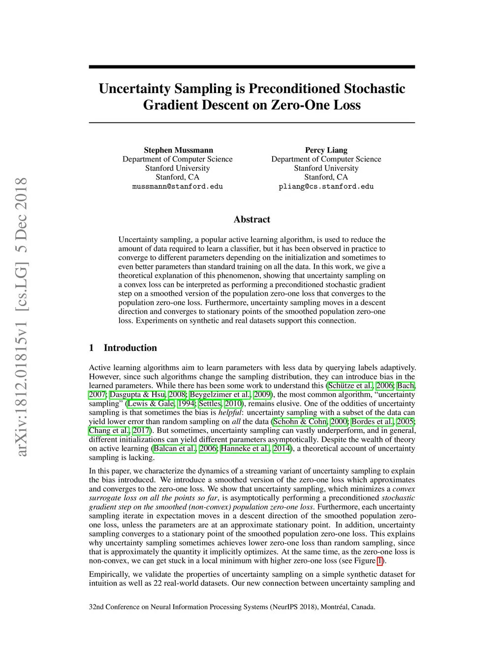 Uncertainty sampling, a popular active learning algorithm, is used to reduce the amount of data required to learn a classifier, but it has been observed in practice to converge to different parameters depending on the initialization and sometimes to even better parameters than standard training on all the data. In this work, we give a theoretical explanation of this phenomenon, showing that uncertainty sampling on a convex loss can be interpreted as performing a preconditioned stochastic gradient step on a smoothed version of the population zero-one loss that converges to the population zero-one loss. Furthermore, uncertainty sampling moves in a descent direction and converges to stationary points of the smoothed population zero-one loss. Experiments on synthetic and real datasets support this connection.