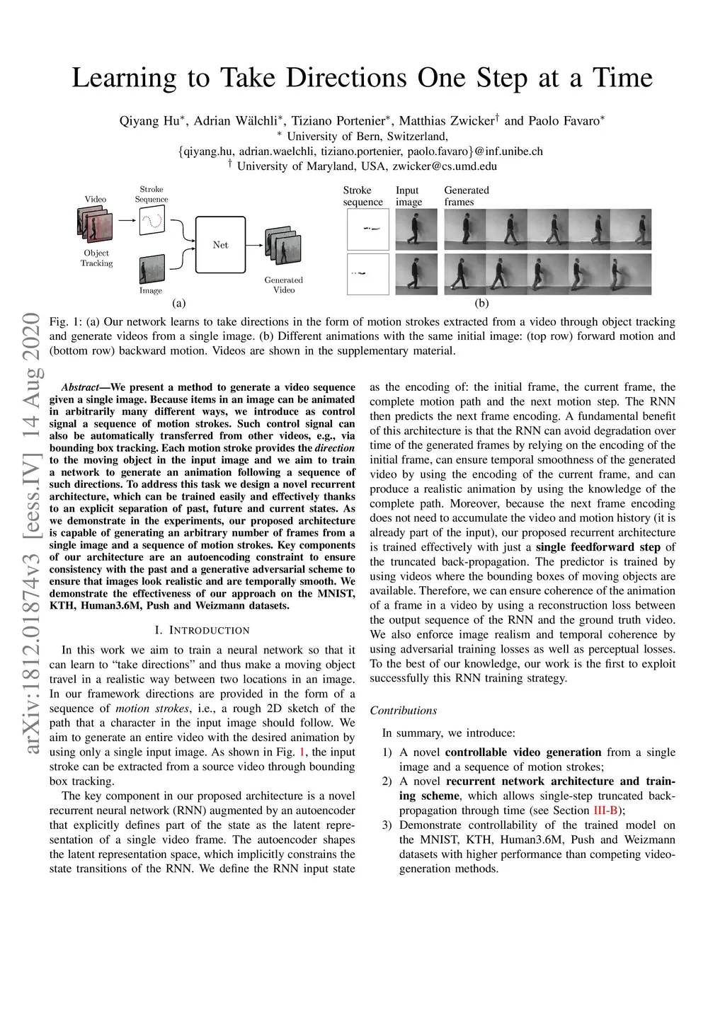 We present a method to generate a video sequence given a single image. Because items in an image can be animated in arbitrarily many different ways, we introduce as control signal a sequence of motion strokes. Such control signal can be automatically transferred from other videos, e.g., via bounding box tracking. Each motion stroke provides the direction to the moving object in the input image and we aim to train a network to generate an animation following a sequence of such directions. To address this task we design a novel recurrent architecture, which can be trained easily and effectively thanks to an explicit separation of past, future and current states. As we demonstrate in the experiments, our proposed architecture is capable of generating an arbitrary number of frames from a single image and a sequence of motion strokes. Key components of our architecture are an autoencoding constraint to ensure consistency with the past and a generative adversarial scheme to ensure that images look realistic and are temporally smooth. We demonstrate the effectiveness of our approach on the MNIST, KTH, Human3.6M, Push and Weizmann datasets.