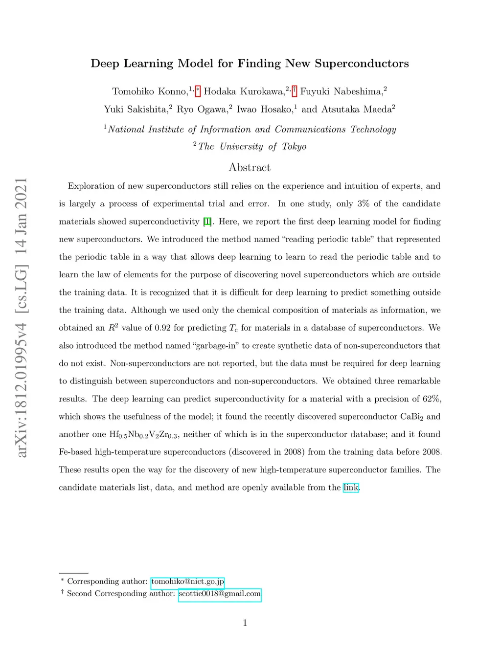 Exploration of new superconductors still relies on the experience and intuition of experts and is largely a process of experimental trial and error. In one study, only 3% of the candidate materials showed superconductivity. Here, we report the first deep learning model for finding new superconductors. We introduced the method named "reading periodic table" which represented the periodic table in a way that allows deep learning to learn to read the periodic table and to learn the law of elements for the purpose of discovering novel superconductors that are outside the training data. It is recognized that it is difficult for deep learning to predict something outside the training data. Although we used only the chemical composition of materials as information, we obtained an value of 0.92 for predicting for materials in a database of superconductors. We also introduced the method named "garbage-in" to create synthetic data of non-superconductors that do not exist. Non-superconductors are not reported, but the data must be required for deep learning to distinguish between superconductors and non-superconductors. We obtained three remarkable results. The deep learning can predict superconductivity for a material with a precision of 62%, which shows the usefulness of the model; it found the recently discovered superconductor CaBi2 and another one Hf0.5Nb0.2V2Zr0.3, neither of which is in the superconductor database; and it found Fe-based high-temperature superconductors (discovered in 2008) from the training data before 2008. These results open the way for the discovery of new high-temperature superconductor families. The candidate materials list, data, and method are openly available from the link https://github.com/tomo835g/Deep-Learning-to-find-Superconductors.