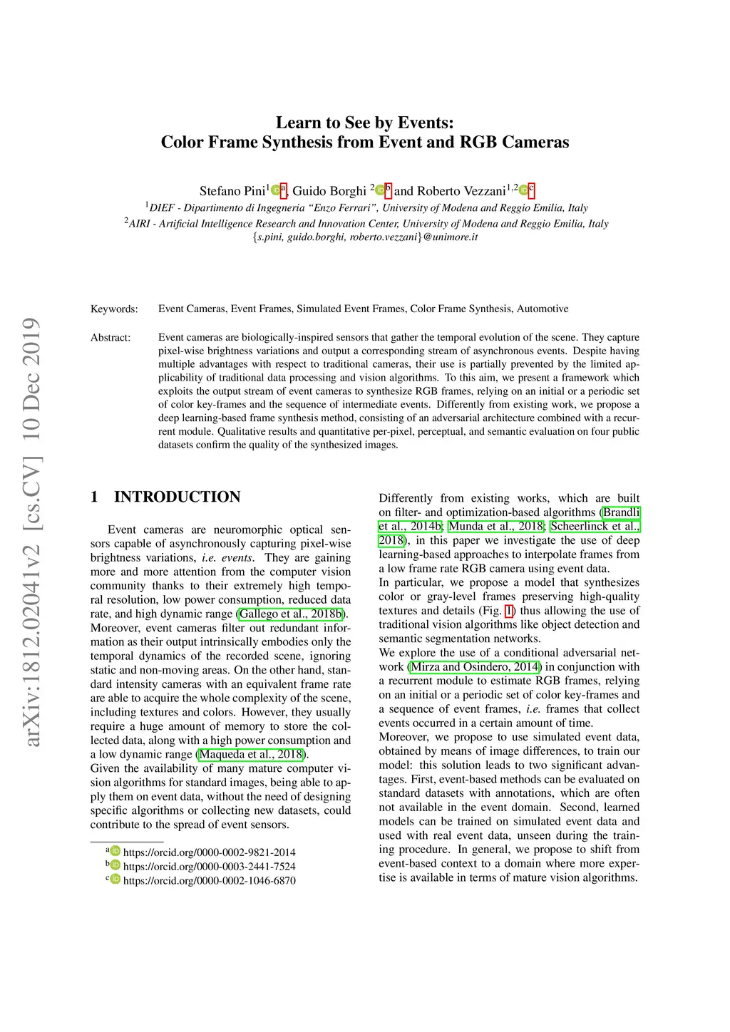 Event cameras are biologically-inspired sensors that gather the temporal evolution of the scene. They capture pixel-wise brightness variations and output a corresponding stream of asynchronous events. Despite having multiple advantages with respect to traditional cameras, their use is partially prevented by the limited applicability of traditional data processing and vision algorithms. To this aim, we present a framework which exploits the output stream of event cameras to synthesize RGB frames, relying on an initial or a periodic set of color key-frames and the sequence of intermediate events. Differently from existing work, we propose a deep learning-based frame synthesis method, consisting of an adversarial architecture combined with a recurrent module. Qualitative results and quantitative per-pixel, perceptual, and semantic evaluation on four public datasets confirm the quality of the synthesized images.
