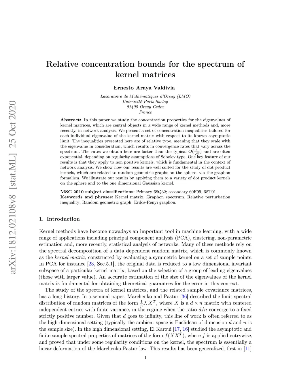 In this paper we study some concentration properties of the kernel matrix associated with a kernel function. More specifically, we derive concentration inequalities for the spectrum of a kernel matrix, quantifying its deviation with respect to the spectrum of an associated integral operator. The main difference with most results in the literature is that we do not assume the positive definiteness of the kernel. Instead, we introduce Sobolev-type hypotheses on the regularity of the kernel. We show how these assumptions are well-suited to the study of kernels depending only on the distance between two points in a metric space, in which case the regularity only depends on the decay of the eigenvalues. This is connected with random geometric graphs, which we study further, giving explicit formulas for the spectrum and its fluctuations.