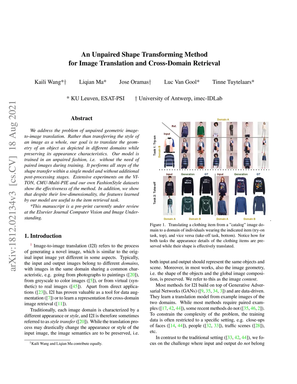 We address the problem of unpaired geometric image-to-image translation. Rather than transferring the style of an image as a whole, our goal is to translate the geometry of an object as depicted in different domains while preserving its appearance characteristics. Our model is trained in an unpaired fashion, i.e. without the need of paired images during training. It performs all steps of the shape transfer within a single model and without additional post-processing stages. Extensive experiments on the VITON, CMU-Multi-PIE and our own FashionStyle datasets show the effectiveness of the method. In addition, we show that despite their low-dimensionality, the features learned by our model are useful to the item retrieval task.