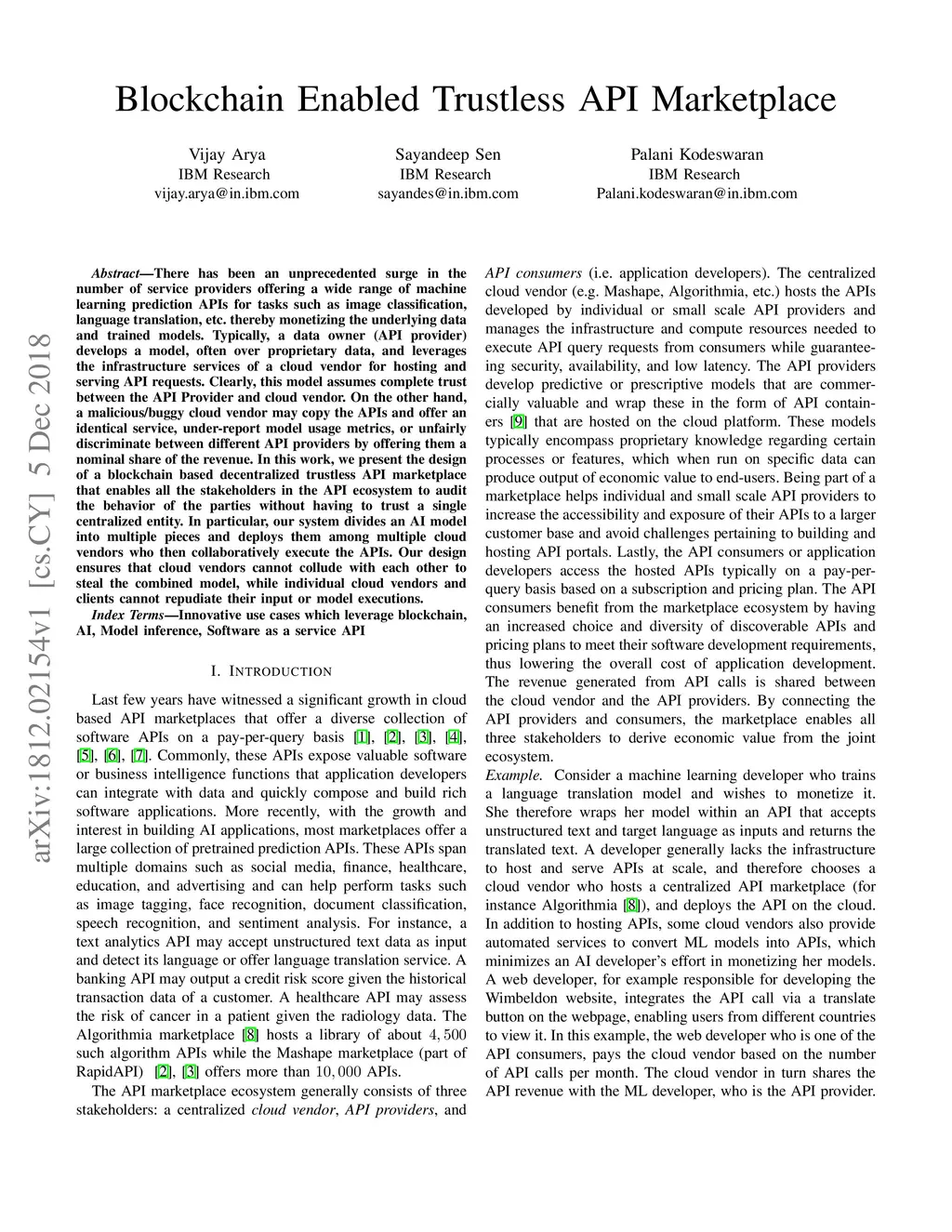 There has been an unprecedented surge in the number of service providers offering a wide range of machine learning prediction APIs for tasks such as image classification, language translation, etc. thereby monetizing the underlying data and trained models. Typically, a data owner (API provider) develops a model, often over proprietary data, and leverages the infrastructure services of a cloud vendor for hosting and serving API requests. Clearly, this model assumes complete trust between the API Provider and cloud vendor. On the other hand, a malicious/buggy cloud vendor may copy the APIs and offer an identical service, under-report model usage metrics, or unfairly discriminate between different API providers by offering them a nominal share of the revenue. In this work, we present the design of a blockchain based decentralized trustless API marketplace that enables all the stakeholders in the API ecosystem to audit the behavior of the parties without having to trust a single centralized entity. In particular, our system divides an AI model into multiple pieces and deploys them among multiple cloud vendors who then collaboratively execute the APIs. Our design ensures that cloud vendors cannot collude with each other to steal the combined model, while individual cloud vendors and clients cannot repudiate their input or model executions.