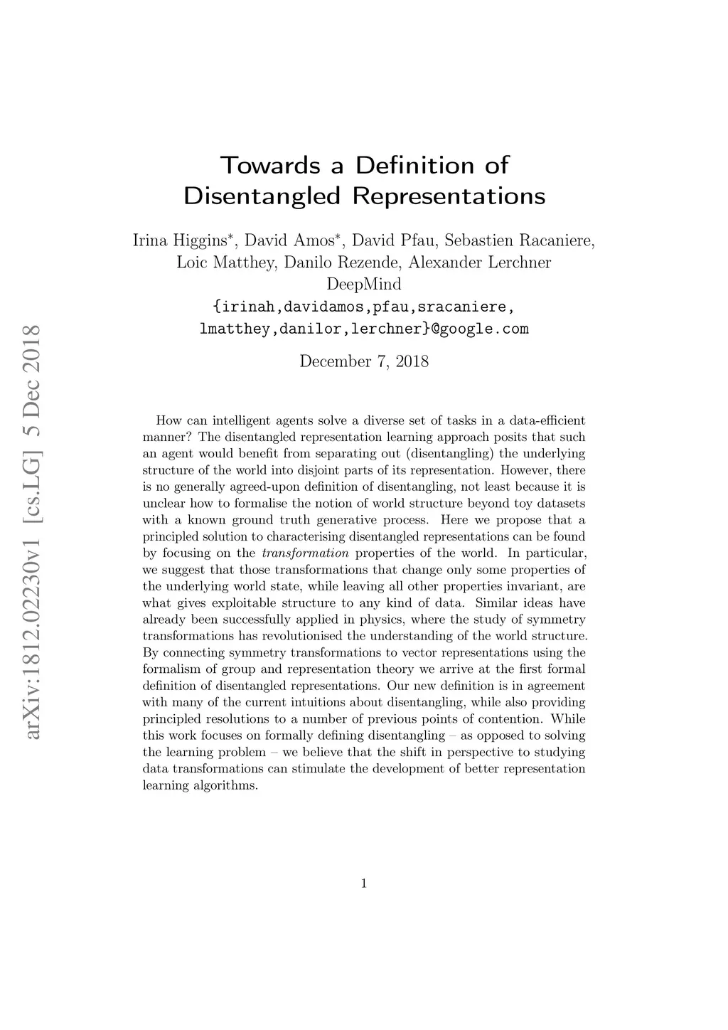How can intelligent agents solve a diverse set of tasks in a data-efficient manner? The disentangled representation learning approach posits that such an agent would benefit from separating out (disentangling) the underlying structure of the world into disjoint parts of its representation. However, there is no generally agreed-upon definition of disentangling, not least because it is unclear how to formalise the notion of world structure beyond toy datasets with a known ground truth generative process. Here we propose that a principled solution to characterising disentangled representations can be found by focusing on the transformation properties of the world. In particular, we suggest that those transformations that change only some properties of the underlying world state, while leaving all other properties invariant, are what gives exploitable structure to any kind of data. Similar ideas have already been successfully applied in physics, where the study of symmetry transformations has revolutionised the understanding of the world structure. By connecting symmetry transformations to vector representations using the formalism of group and representation theory we arrive at the first formal definition of disentangled representations. Our new definition is in agreement with many of the current intuitions about disentangling, while also providing principled resolutions to a number of previous points of contention. While this work focuses on formally defining disentangling - as opposed to solving the learning problem - we believe that the shift in perspective to studying data transformations can stimulate the development of better representation learning algorithms.