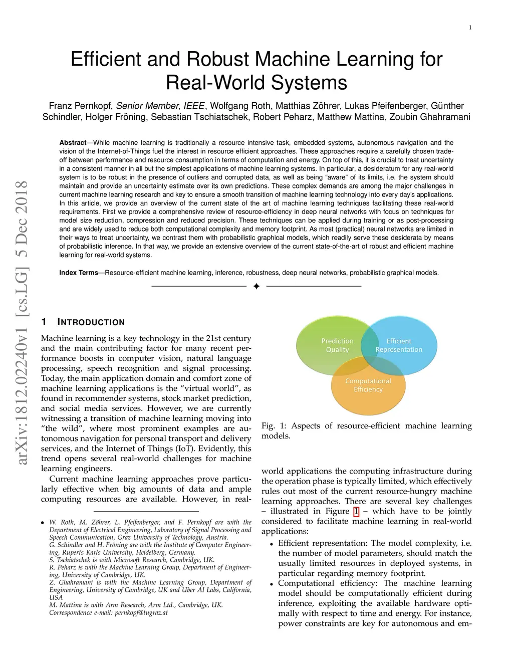 While machine learning is traditionally a resource intensive task, embedded systems, autonomous navigation and the vision of the Internet-of-Things fuel the interest in resource efficient approaches. These approaches require a carefully chosen trade-off between performance and resource consumption in terms of computation and energy. On top of this, it is crucial to treat uncertainty in a consistent manner in all but the simplest applications of machine learning systems. In particular, a desideratum for any real-world system is to be robust in the presence of outliers and corrupted data, as well as being `aware' of its limits, i.e.\ the system should maintain and provide an uncertainty estimate over its own predictions. These complex demands are among the major challenges in current machine learning research and key to ensure a smooth transition of machine learning technology into every day's applications. In this article, we provide an overview of the current state of the art of machine learning techniques facilitating these real-world requirements. First we provide a comprehensive review of resource-efficiency in deep neural networks with focus on techniques for model size reduction, compression and reduced precision. These techniques can be applied during training or as post-processing and are widely used to reduce both computational complexity and memory footprint. As most (practical) neural networks are limited in their ways to treat uncertainty, we contrast them with probabilistic graphical models, which readily serve these desiderata by means of probabilistic inference. In that way, we provide an extensive overview of the current state-of-the-art of robust and efficient machine learning for real-world systems.