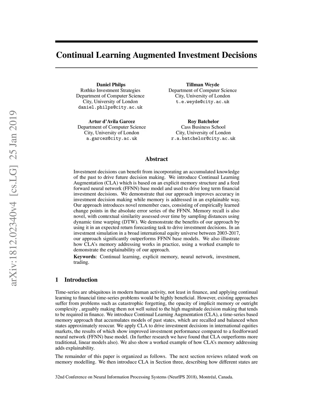 Investment decisions can benefit from incorporating an accumulated knowledge of the past to drive future decision making. We introduce Continual Learning Augmentation (CLA) which is based on an explicit memory structure and a feed forward neural network (FFNN) base model and used to drive long term financial investment decisions. We demonstrate that our approach improves accuracy in investment decision making while memory is addressed in an explainable way. Our approach introduces novel remember cues, consisting of empirically learned change points in the absolute error series of the FFNN. Memory recall is also novel, with contextual similarity assessed over time by sampling distances using dynamic time warping (DTW). We demonstrate the benefits of our approach by using it in an expected return forecasting task to drive investment decisions. In an investment simulation in a broad international equity universe between 2003-2017, our approach significantly outperforms FFNN base models. We also illustrate how CLA's memory addressing works in practice, using a worked example to demonstrate the explainability of our approach.