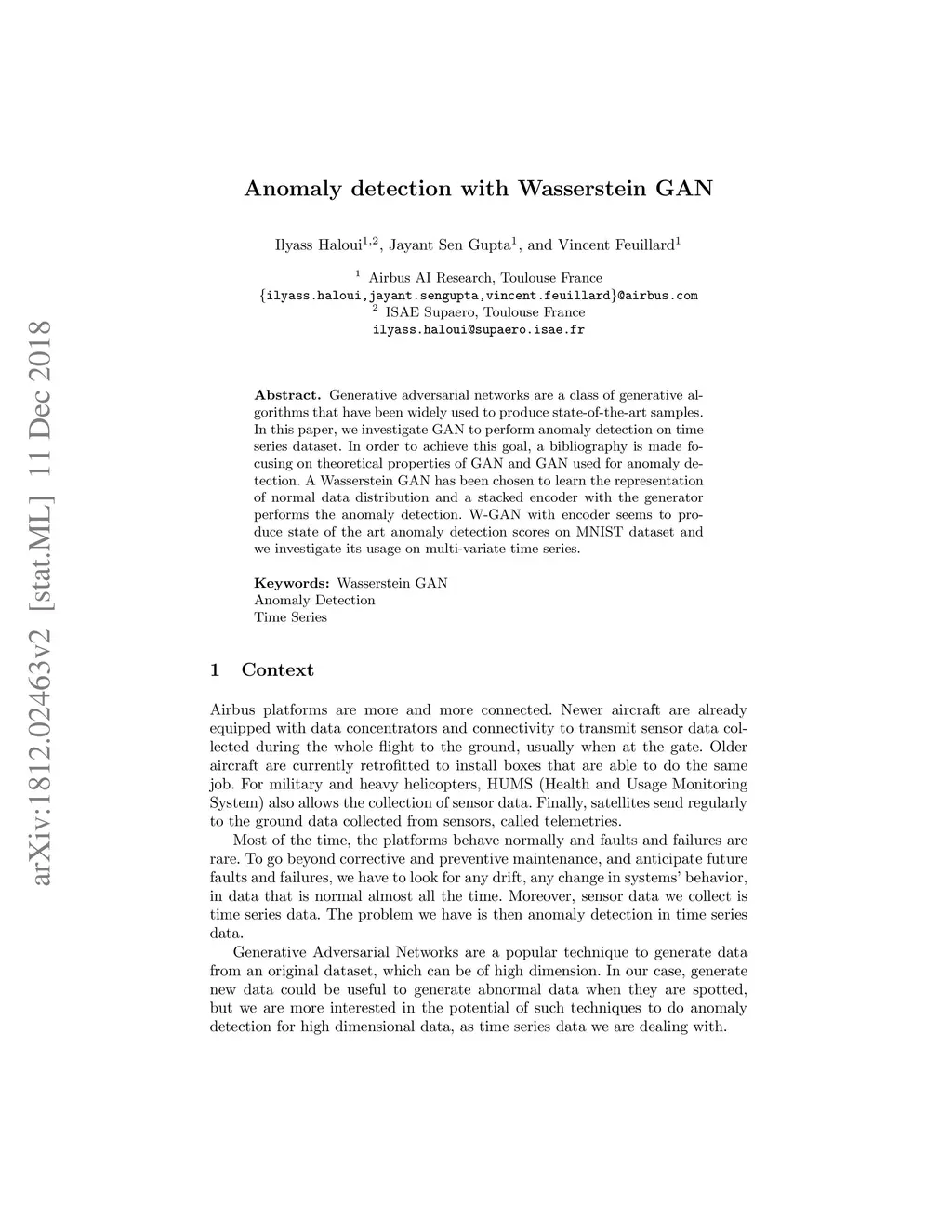 Generative adversarial networks are a class of generative algorithms that have been widely used to produce state-of-the-art samples. In this paper, we investigate GAN to perform anomaly detection on time series dataset. In order to achieve this goal, a bibliography is made focusing on theoretical properties of GAN and GAN used for anomaly detection. A Wasserstein GAN has been chosen to learn the representation of normal data distribution and a stacked encoder with the generator performs the anomaly detection. W-GAN with encoder seems to produce state of the art anomaly detection scores on MNIST dataset and we investigate its usage on multi-variate time series.