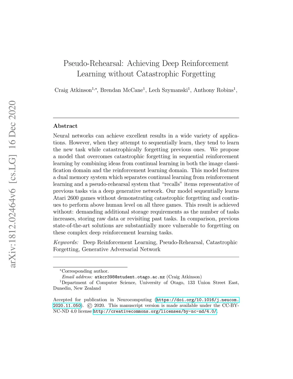 Neural networks can achieve excellent results in a wide variety of applications. However, when they attempt to sequentially learn, they tend to learn the new task while catastrophically forgetting previous ones. We propose a model that overcomes catastrophic forgetting in sequential reinforcement learning by combining ideas from continual learning in both the image classification domain and the reinforcement learning domain. This model features a dual memory system which separates continual learning from reinforcement learning and a pseudo-rehearsal system that "recalls" items representative of previous tasks via a deep generative network. Our model sequentially learns Atari 2600 games without demonstrating catastrophic forgetting and continues to perform above human level on all three games. This result is achieved without: demanding additional storage requirements as the number of tasks increases, storing raw data or revisiting past tasks. In comparison, previous state-of-the-art solutions are substantially more vulnerable to forgetting on these complex deep reinforcement learning tasks.