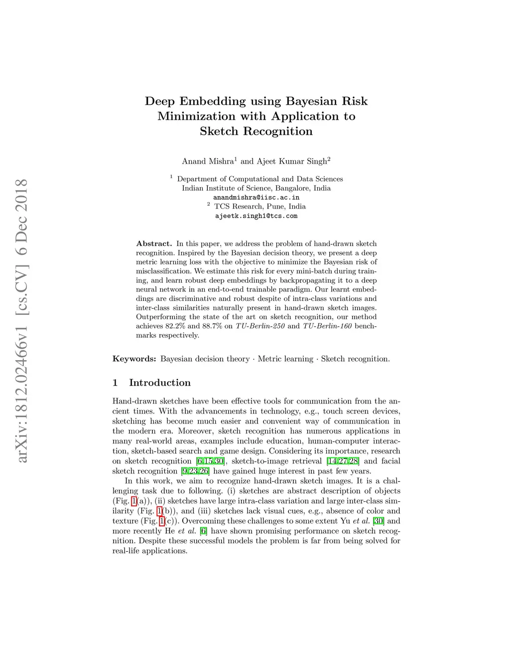 In this paper, we address the problem of hand-drawn sketch recognition. Inspired by the Bayesian decision theory, we present a deep metric learning loss with the objective to minimize the Bayesian risk of misclassification. We estimate this risk for every mini-batch during training, and learn robust deep embeddings by backpropagating it to a deep neural network in an end-to-end trainable paradigm. Our learnt embeddings are discriminative and robust despite of intra-class variations and inter-class similarities naturally present in hand-drawn sketch images. Outperforming the state of the art on sketch recognition, our method achieves 82.2% and 88.7% on TU-Berlin-250 and TU-Berlin-160 benchmarks respectively.