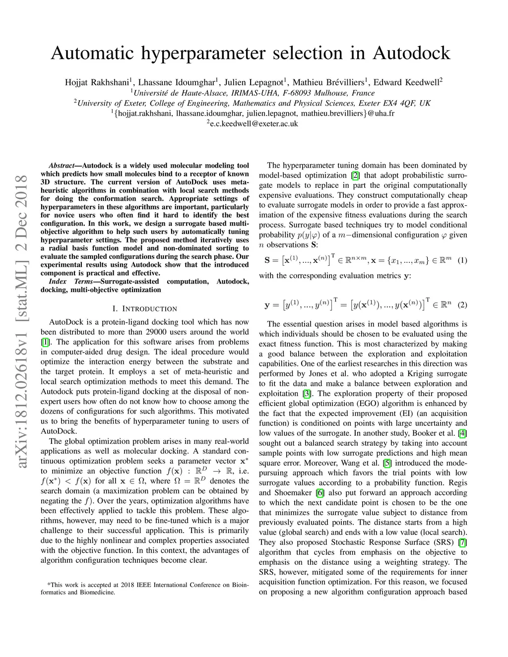 Autodock is a widely used molecular modeling tool which predicts how small molecules bind to a receptor of known 3D structure. The current version of AutoDock uses meta-heuristic algorithms in combination with local search methods for doing the conformation search. Appropriate settings of hyperparameters in these algorithms are important, particularly for novice users who often find it hard to identify the best configuration. In this work, we design a surrogate based multi-objective algorithm to help such users by automatically tuning hyperparameter settings. The proposed method iteratively uses a radial basis function model and non-dominated sorting to evaluate the sampled configurations during the search phase. Our experimental results using Autodock show that the introduced component is practical and effective.