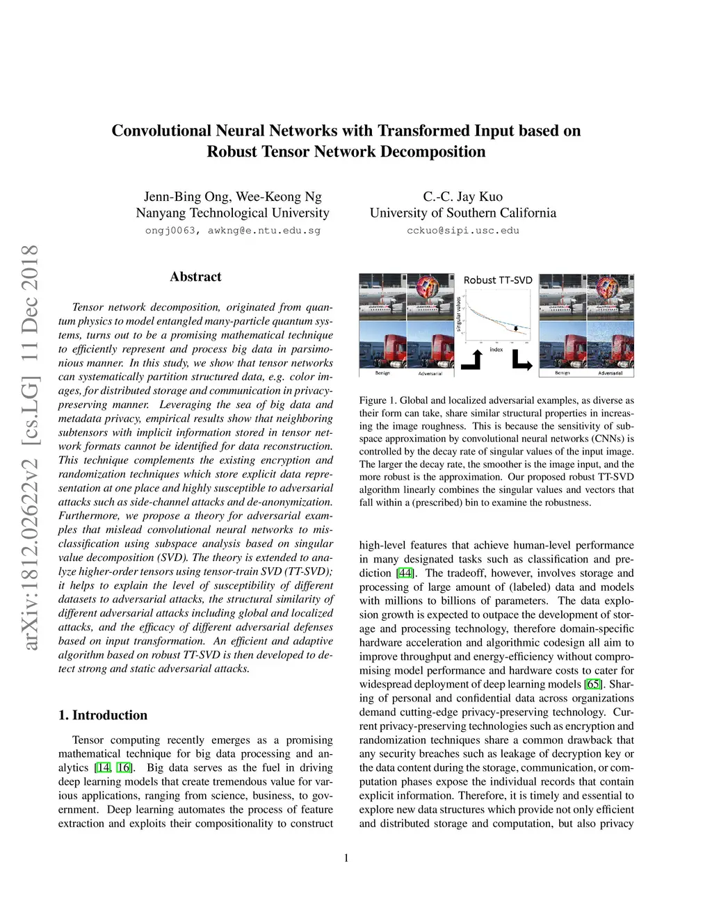 Tensor network decomposition, originated from quantum physics to model entangled many-particle quantum systems, turns out to be a promising mathematical technique to efficiently represent and process big data in parsimonious manner. In this study, we show that tensor networks can systematically partition structured data, e.g. color images, for distributed storage and communication in privacy-preserving manner. Leveraging the sea of big data and metadata privacy, empirical results show that neighbouring subtensors with implicit information stored in tensor network formats cannot be identified for data reconstruction. This technique complements the existing encryption and randomization techniques which store explicit data representation at one place and highly susceptible to adversarial attacks such as side-channel attacks and de-anonymization. Furthermore, we propose a theory for adversarial examples that mislead convolutional neural networks to misclassification using subspace analysis based on singular value decomposition (SVD). The theory is extended to analyze higher-order tensors using tensor-train SVD (TT-SVD); it helps to explain the level of susceptibility of different datasets to adversarial attacks, the structural similarity of different adversarial attacks including global and localized attacks, and the efficacy of different adversarial defenses based on input transformation. An efficient and adaptive algorithm based on robust TT-SVD is then developed to detect strong and static adversarial attacks.