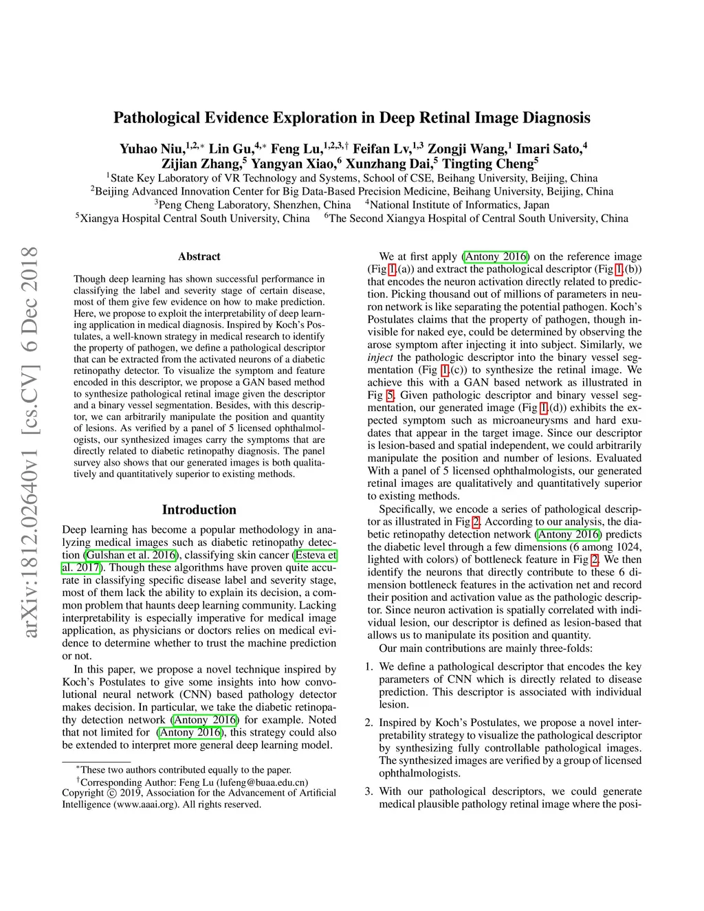 Though deep learning has shown successful performance in classifying the label and severity stage of certain disease, most of them give few evidence on how to make prediction. Here, we propose to exploit the interpretability of deep learning application in medical diagnosis. Inspired by Koch's Postulates, a well-known strategy in medical research to identify the property of pathogen, we define a pathological descriptor that can be extracted from the activated neurons of a diabetic retinopathy detector. To visualize the symptom and feature encoded in this descriptor, we propose a GAN based method to synthesize pathological retinal image given the descriptor and a binary vessel segmentation. Besides, with this descriptor, we can arbitrarily manipulate the position and quantity of lesions. As verified by a panel of 5 licensed ophthalmologists, our synthesized images carry the symptoms that are directly related to diabetic retinopathy diagnosis. The panel survey also shows that our generated images is both qualitatively and quantitatively superior to existing methods.