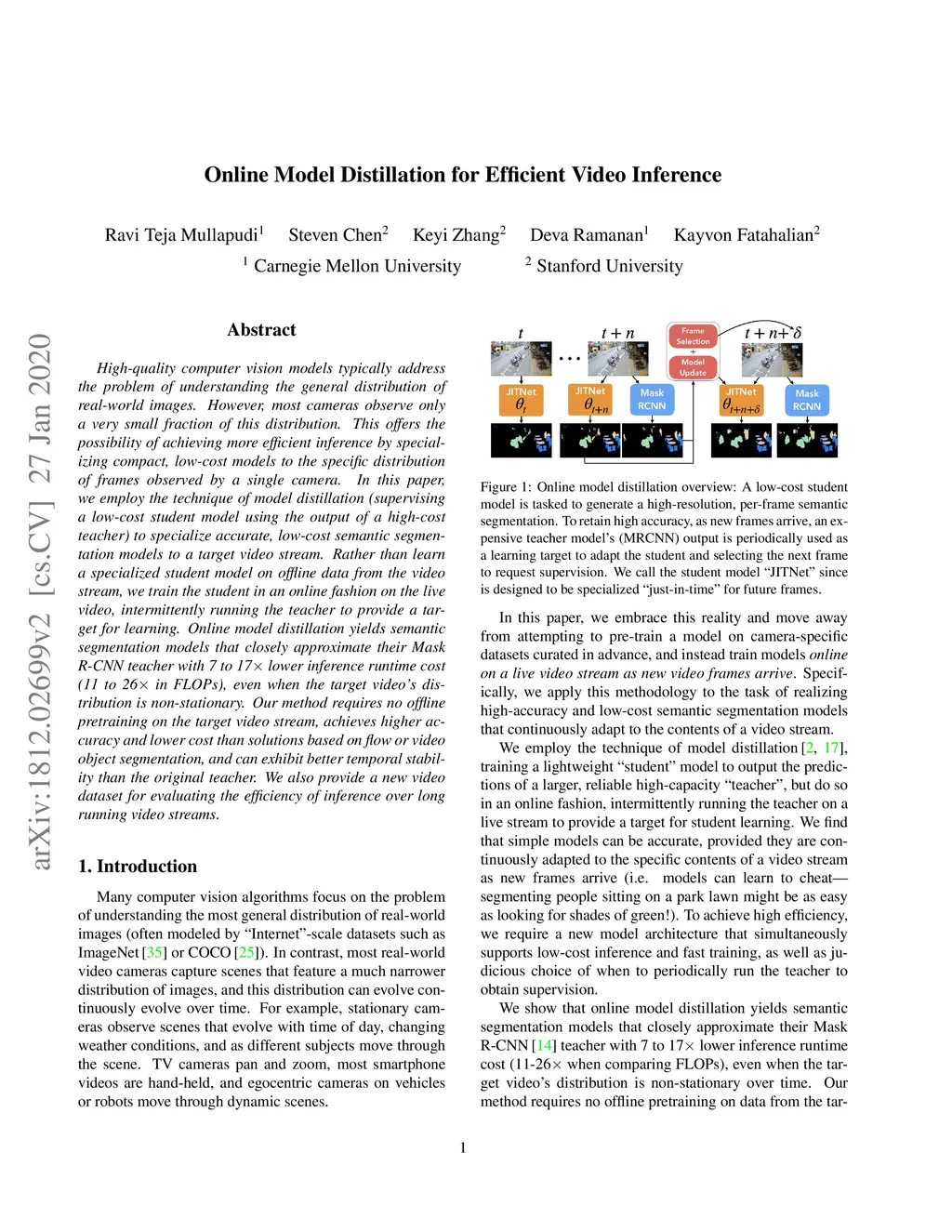 High-quality computer vision models typically address the problem of understanding the general distribution of real-world images. However, most cameras observe only a very small fraction of this distribution. This offers the possibility of achieving more efficient inference by specializing compact, low-cost models to the specific distribution of frames observed by a single camera. In this paper, we employ the technique of model distillation (supervising a low-cost student model using the output of a high-cost teacher) to specialize accurate, low-cost semantic segmentation models to a target video stream. Rather than learn a specialized student model on offline data from the video stream, we train the student in an online fashion on the live video, intermittently running the teacher to provide a target for learning. Online model distillation yields semantic segmentation models that closely approximate their Mask R-CNN teacher with 7 to 17 lower inference runtime cost (11 to 26 in FLOPs), even when the target video's distribution is non-stationary. Our method requires no offline pretraining on the target video stream, achieves higher accuracy and lower cost than solutions based on flow or video object segmentation, and can exhibit better temporal stability than the original teacher. We also provide a new video dataset for evaluating the efficiency of inference over long running video streams.