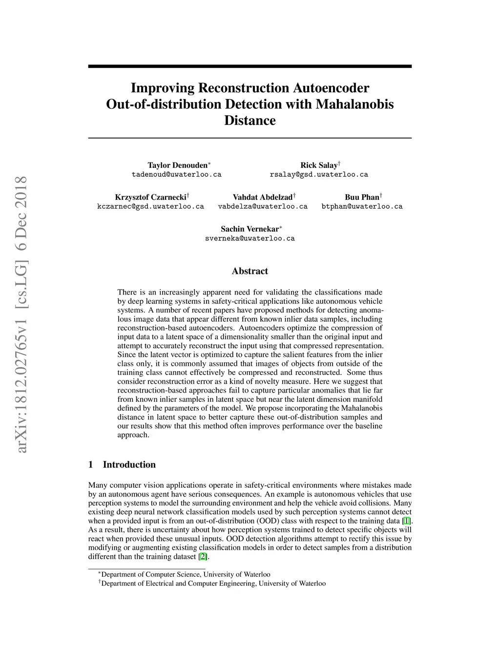 There is an increasingly apparent need for validating the classifications made by deep learning systems in safety-critical applications like autonomous vehicle systems. A number of recent papers have proposed methods for detecting anomalous image data that appear different from known inlier data samples, including reconstruction-based autoencoders. Autoencoders optimize the compression of input data to a latent space of a dimensionality smaller than the original input and attempt to accurately reconstruct the input using that compressed representation. Since the latent vector is optimized to capture the salient features from the inlier class only, it is commonly assumed that images of objects from outside of the training class cannot effectively be compressed and reconstructed. Some thus consider reconstruction error as a kind of novelty measure. Here we suggest that reconstruction-based approaches fail to capture particular anomalies that lie far from known inlier samples in latent space but near the latent dimension manifold defined by the parameters of the model. We propose incorporating the Mahalanobis distance in latent space to better capture these out-of-distribution samples and our results show that this method often improves performance over the baseline approach.