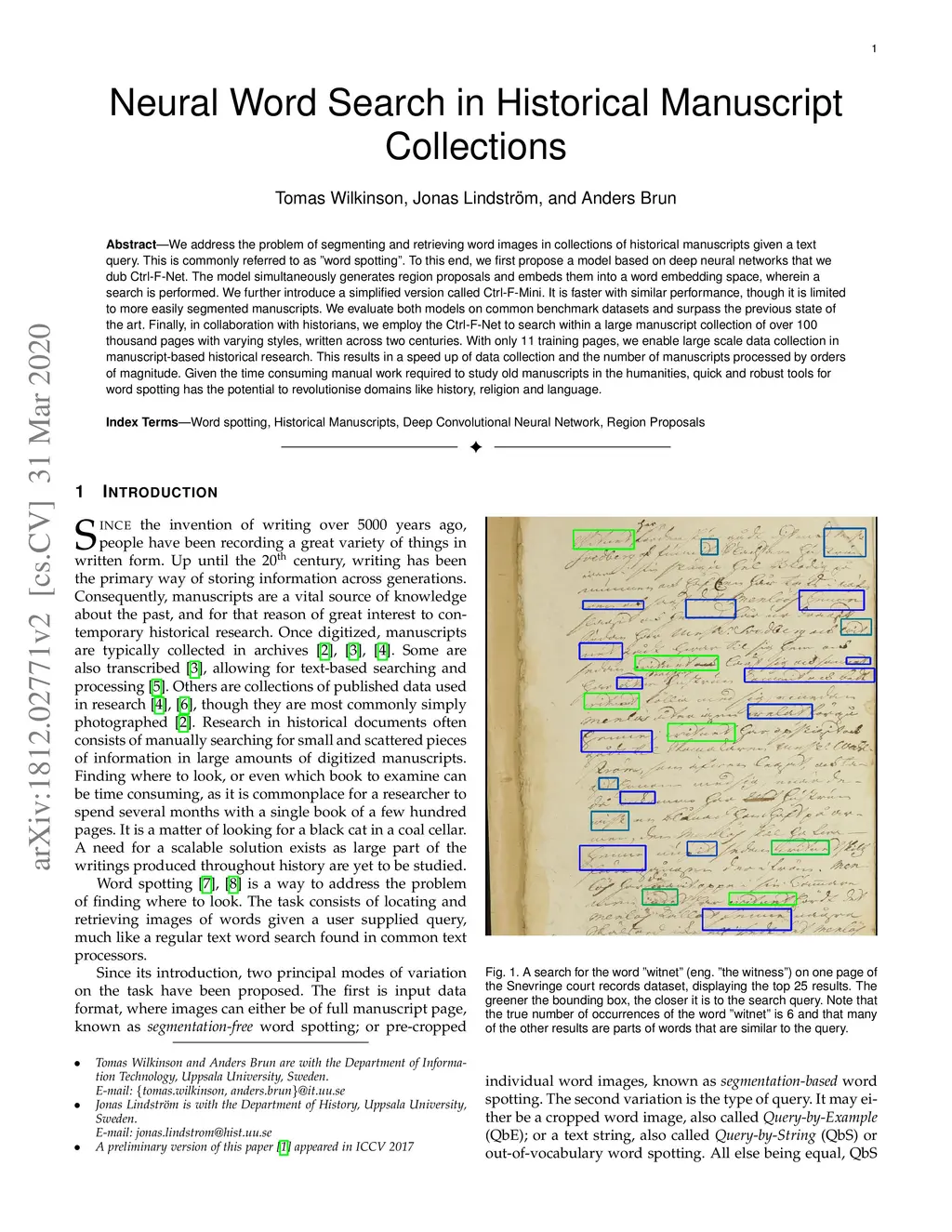 We address the problem of segmenting and retrieving word images in collections of historical manuscripts given a text query. This is commonly referred to as "word spotting". To this end, we first propose an end-to-end trainable model based on deep neural networks that we dub Ctrl-F-Net. The model simultaneously generates region proposals and embeds them into a word embedding space, wherein a search is performed. We further introduce a simplified version called Ctrl-F-Mini. It is faster with similar performance, though it is limited to more easily segmented manuscripts. We evaluate both models on common benchmark datasets and surpass the previous state of the art. Finally, in collaboration with historians, we employ the Ctrl-F-Net to search within a large manuscript collection of over 100 thousand pages, written across two centuries. With only 11 training pages, we enable large scale data collection in manuscript-based historical research. This results in a speed up of data collection and the number of manuscripts processed by orders of magnitude. Given the time consuming manual work required to study old manuscripts in the humanities, quick and robust tools for word spotting has the potential to revolutionise domains like history, religion and language.