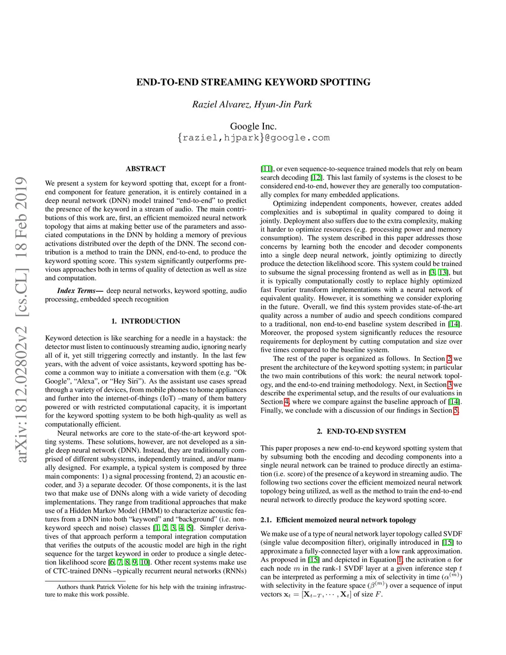 We present a system for keyword spotting that, except for a frontend component for feature generation, it is entirely contained in a deep neural network (DNN) model trained "end-to-end" to predict the presence of the keyword in a stream of audio. The main contributions of this work are, first, an efficient memoized neural network topology that aims at making better use of the parameters and associated computations in the DNN by holding a memory of previous activations distributed over the depth of the DNN. The second contribution is a method to train the DNN, end-to-end, to produce the keyword spotting score. This system significantly outperforms previous approaches both in terms of quality of detection as well as size and computation.