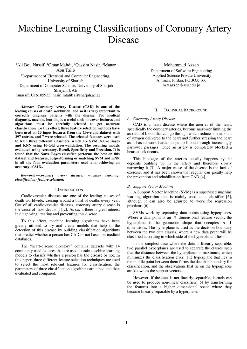 Coronary Artery Disease (CAD) is one of the leading causes of death worldwide, and so it is very important to correctly diagnose patients with the disease. For medical diagnosis, machine learning is a useful tool, however features and algorithms must be carefully selected to get accurate classification. To this effect, three feature selection methods have been used on 13 input features from the Cleveland dataset with 297 entries, and 7 were selected. The selected features were used to train three different classifiers, which are SVM, Na\"ive Bayes and KNN using 10-fold cross-validation. The resulting models evaluated using Accuracy, Recall, Specificity and Precision. It is found that the Na\"ive Bayes classifier performs the best on this dataset and features, outperforming or matching SVM and KNN in all the four evaluation parameters used and achieving an accuracy of 84%.
