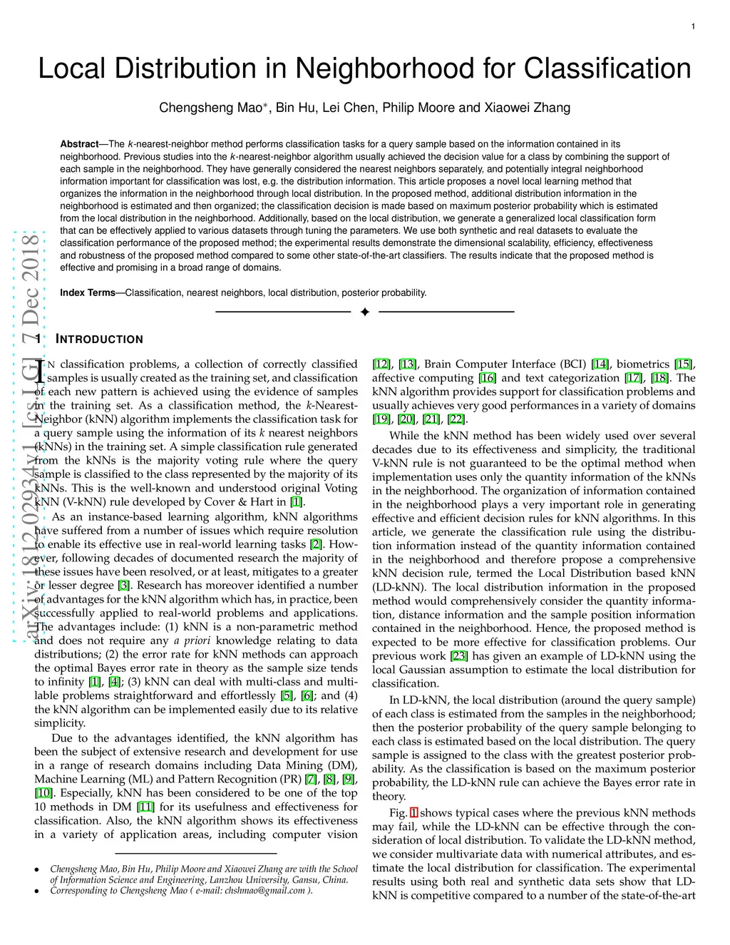 The k-nearest-neighbor method performs classification tasks for a query sample based on the information contained in its neighborhood. Previous studies into the k-nearest-neighbor algorithm usually achieved the decision value for a class by combining the support of each sample in the neighborhood. They have generally considered the nearest neighbors separately, and potentially integral neighborhood information important for classification was lost, e.g. the distribution information. This article proposes a novel local learning method that organizes the information in the neighborhood through local distribution. In the proposed method, additional distribution information in the neighborhood is estimated and then organized; the classification decision is made based on maximum posterior probability which is estimated from the local distribution in the neighborhood. Additionally, based on the local distribution, we generate a generalized local classification form that can be effectively applied to various datasets through tuning the parameters. We use both synthetic and real datasets to evaluate the classification performance of the proposed method; the experimental results demonstrate the dimensional scalability, efficiency, effectiveness and robustness of the proposed method compared to some other state-of-the-art classifiers. The results indicate that the proposed method is effective and promising in a broad range of domains.
