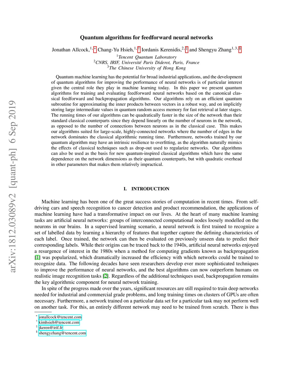 Quantum machine learning has the potential for broad industrial applications, and the development of quantum algorithms for improving the performance of neural networks is of particular interest given the central role they play in machine learning today. In this paper we present quantum algorithms for training and evaluating feedforward neural networks based on the canonical classical feedforward and backpropagation algorithms. Our algorithms rely on an efficient quantum subroutine for approximating the inner products between vectors in a robust way, and on implicitly storing large intermediate values in quantum random access memory for fast retrieval at later stages. The running times of our algorithms can be quadratically faster in the size of the network than their standard classical counterparts since they depend linearly on the number of neurons in the network, as opposed to the number of connections between neurons as in the classical case. This makes our algorithms suited for large-scale, highly-connected networks where the number of edges in the network dominates the classical algorithmic running time. Furthermore, networks trained by our quantum algorithm may have an intrinsic resilience to overfitting, as the algorithm naturally mimics the effects of classical techniques such as drop-out used to regularize networks. Our algorithms can also be used as the basis for new quantum-inspired classical algorithms which have the same dependence on the network dimensions as their quantum counterparts, but with quadratic overhead in other parameters that makes them relatively impractical.
