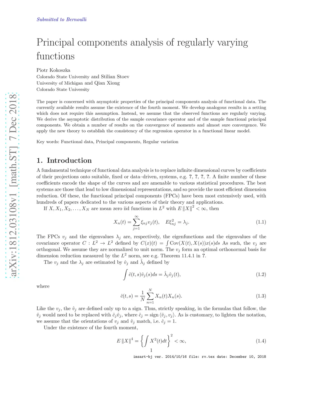 The paper is concerned with asymptotic properties of the principal components analysis of functional data. The currently available results assume the existence of the fourth moment. We develop analogous results in a setting which does not require this assumption. Instead, we assume that the observed functions are regularly varying. We derive the asymptotic distribution of the sample covariance operator and of the sample functional principal components. We obtain a number of results on the convergence of moments and almost sure convergence. We apply the new theory to establish the consistency of the regression operator in a functional linear model.