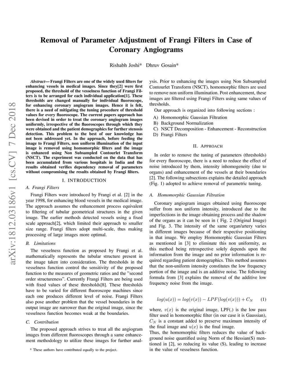 Frangi Filters are one of the widely used filters for enhancing vessels in medical images. Since they were first proposed, the threshold of the vesselness function of Frangi Filters is to be arranged for each individual application. These thresholds are changed manually for individual fluoroscope, for enhancing coronary angiogram images. Hence it is felt, there is a need of mitigating the tuning procedure of threshold values for every fluoroscope. The current papers approach has been devised in order to treat the coronary angiogram images uniformly, irrespective of the fluoroscopes through which they were obtained and the patient demographics for further stenosis detection. This problem to the best of our knowledge has not been addressed yet. In the approach, before feeding the image to Frangi Filters, non uniform illumination of the input image is removed using homomorphic filters and the image is enhanced using Non Subsampled Contourlet Transform (NSCT). The experiment was conducted on the data that has been accumulated from various hospitals in India and the results obtained verifies dependency removal of parameters without compromising the results obtained by Frangi filters.