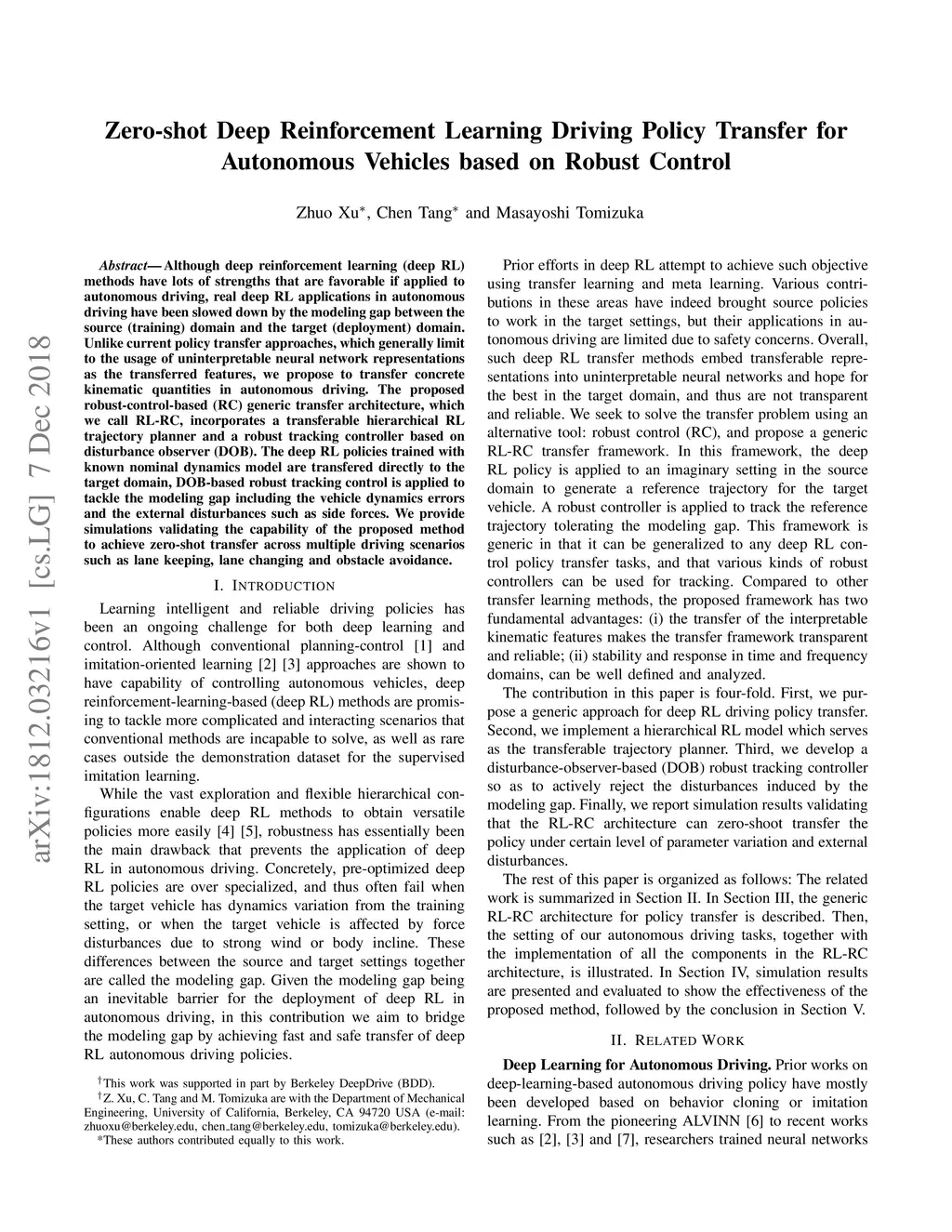 Although deep reinforcement learning (deep RL) methods have lots of strengths that are favorable if applied to autonomous driving, real deep RL applications in autonomous driving have been slowed down by the modeling gap between the source (training) domain and the target (deployment) domain. Unlike current policy transfer approaches, which generally limit to the usage of uninterpretable neural network representations as the transferred features, we propose to transfer concrete kinematic quantities in autonomous driving. The proposed robust-control-based (RC) generic transfer architecture, which we call RL-RC, incorporates a transferable hierarchical RL trajectory planner and a robust tracking controller based on disturbance observer (DOB). The deep RL policies trained with known nominal dynamics model are transfered directly to the target domain, DOB-based robust tracking control is applied to tackle the modeling gap including the vehicle dynamics errors and the external disturbances such as side forces. We provide simulations validating the capability of the proposed method to achieve zero-shot transfer across multiple driving scenarios such as lane keeping, lane changing and obstacle avoidance.