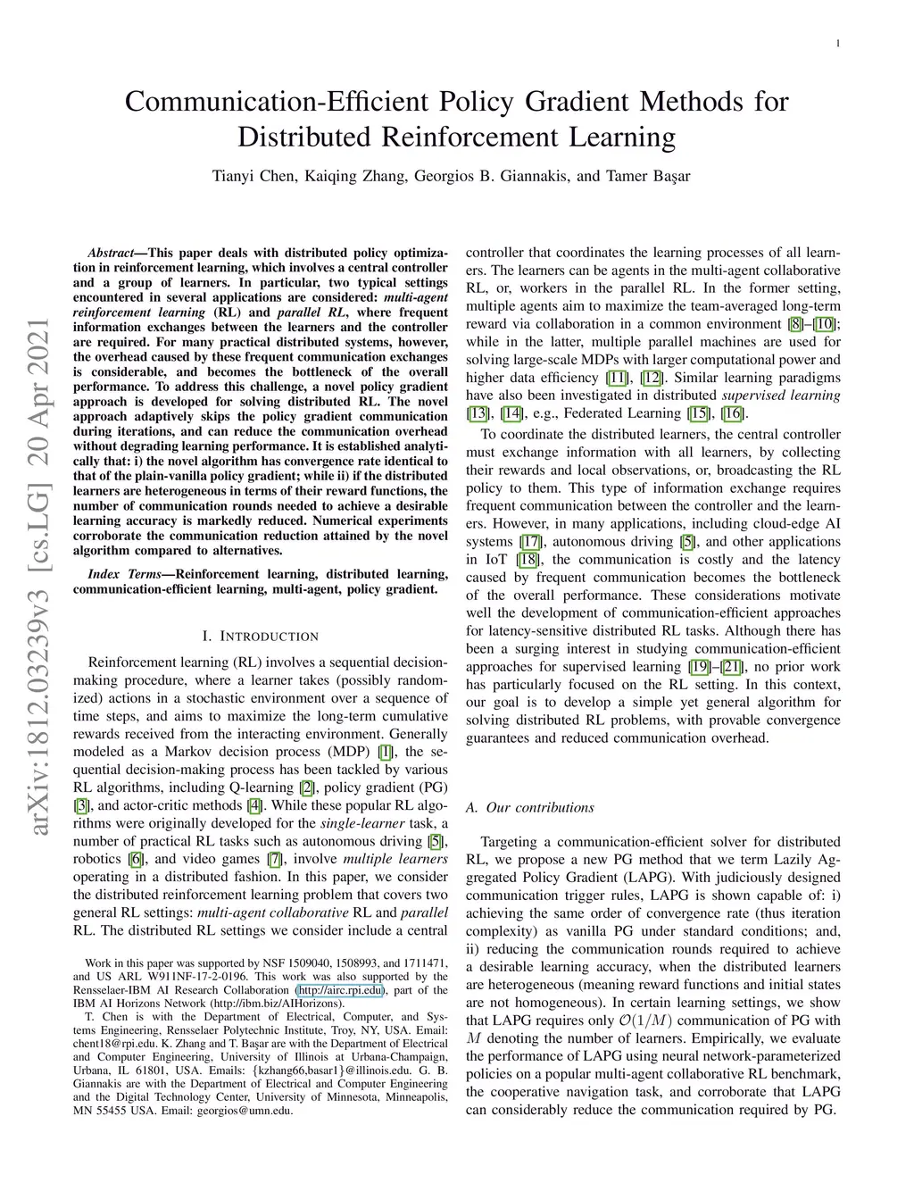 This paper deals with distributed policy optimization in reinforcement learning, which involves a central controller and a group of learners. In particular, two typical settings encountered in several applications are considered: multi-agent reinforcement learning (RL) and parallel RL, where frequent information exchanges between the learners and the controller are required. For many practical distributed systems, however, the overhead caused by these frequent communication exchanges is considerable, and becomes the bottleneck of the overall performance. To address this challenge, a novel policy gradient approach is developed for solving distributed RL. The novel approach adaptively skips the policy gradient communication during iterations, and can reduce the communication overhead without degrading learning performance. It is established analytically that: i) the novel algorithm has convergence rate identical to that of the plain-vanilla policy gradient; while ii) if the distributed learners are heterogeneous in terms of their reward functions, the number of communication rounds needed to achieve a desirable learning accuracy is markedly reduced. Numerical experiments corroborate the communication reduction attained by the novel algorithm compared to alternatives.