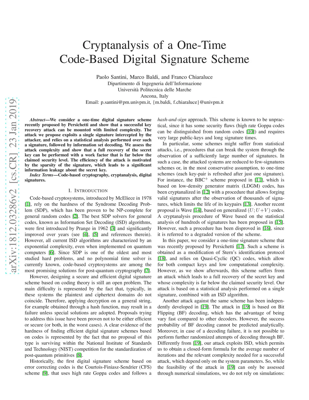 We consider a one-time digital signature scheme recently proposed by Persichetti and show that a successful key recovery attack can be mounted with limited complexity. The attack we propose exploits a single signature intercepted by the attacker, and relies on a statistical analysis performed over such a signature, followed by information set decoding. We assess the attack complexity and show that a full recovery of the secret key can be performed with a work factor that is far below the claimed security level. The efficiency of the attack is motivated by the sparsity of the signature, which leads to a significant information leakage about the secret key.