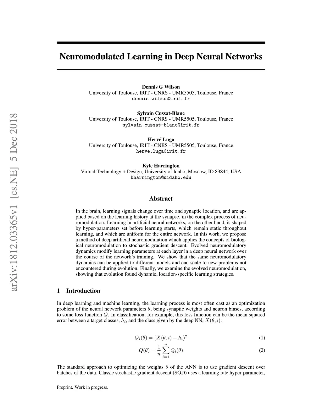 In the brain, learning signals change over time and synaptic location, and are applied based on the learning history at the synapse, in the complex process of neuromodulation. Learning in artificial neural networks, on the other hand, is shaped by hyper-parameters set before learning starts, which remain static throughout learning, and which are uniform for the entire network. In this work, we propose a method of deep artificial neuromodulation which applies the concepts of biological neuromodulation to stochastic gradient descent. Evolved neuromodulatory dynamics modify learning parameters at each layer in a deep neural network over the course of the network's training. We show that the same neuromodulatory dynamics can be applied to different models and can scale to new problems not encountered during evolution. Finally, we examine the evolved neuromodulation, showing that evolution found dynamic, location-specific learning strategies.