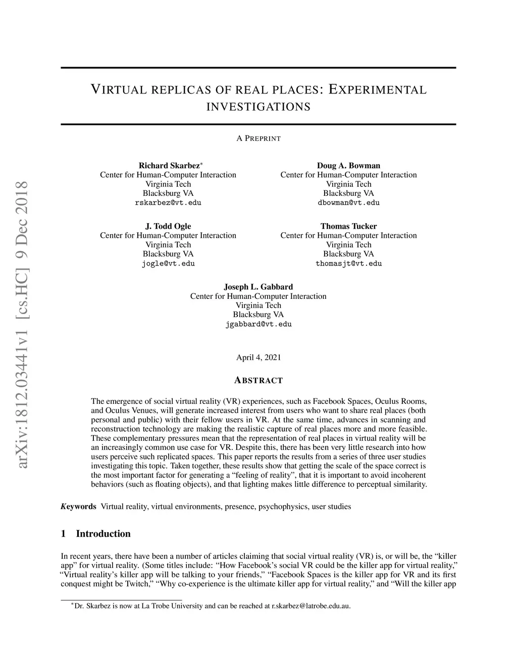 The emergence of social virtual reality (VR) experiences, such as Facebook Spaces, Oculus Rooms, and Oculus Venues, will generate increased interest from users who want to share real places (both personal and public) with their fellow users in VR. At the same time, advances in scanning and reconstruction technology are making the realistic capture of real places more and more feasible. These complementary pressures mean that the representation of real places in virtual reality will be an increasingly common use case for VR. Despite this, there has been very little research into how users perceive such replicated spaces. This paper reports the results from a series of three user studies investigating this topic. Taken together, these results show that getting the scale of the space correct is the most important factor for generating a "feeling of reality", that it is important to avoid incoherent behaviors (such as floating objects), and that lighting makes little difference to perceptual similarity.