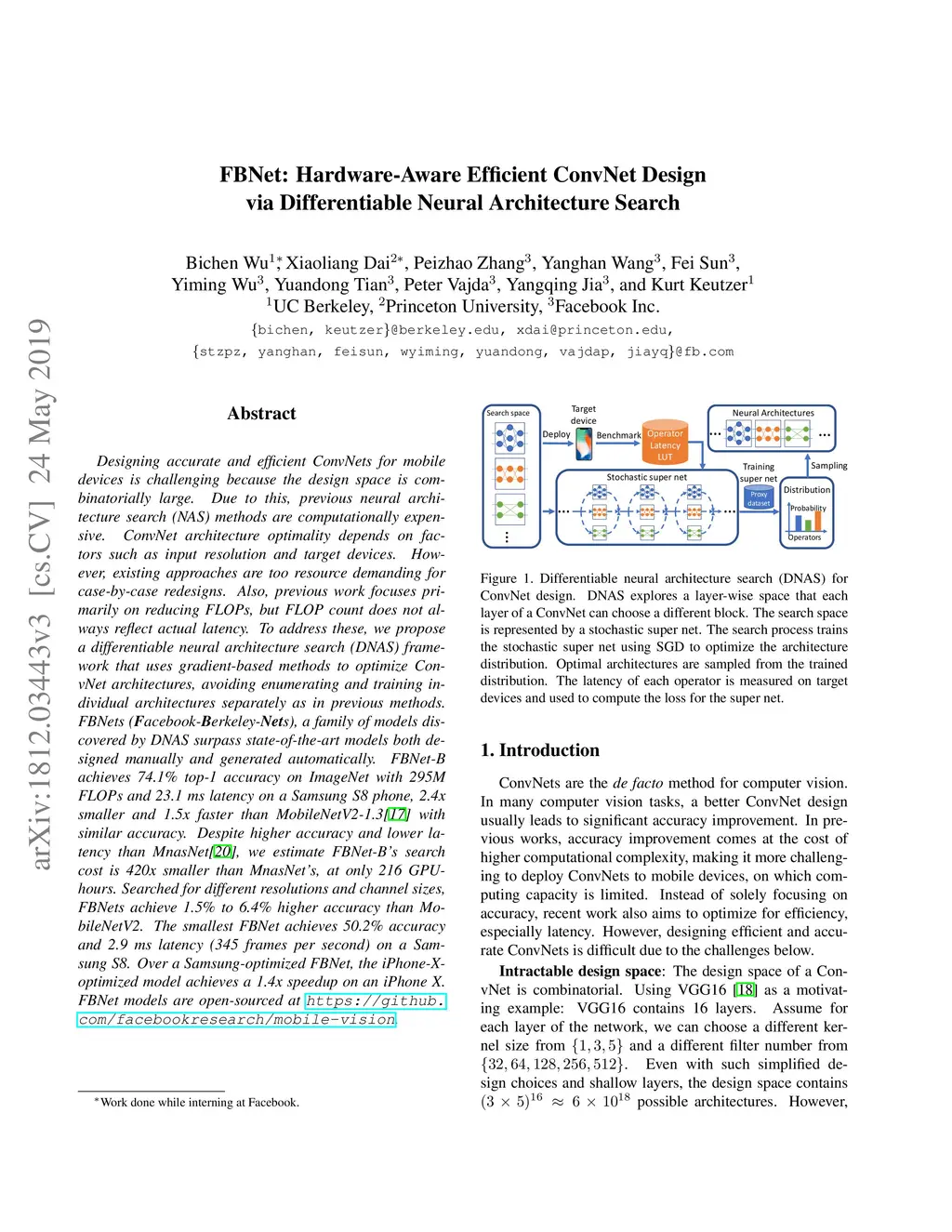 FBNet: Hardware-Aware Efficient ConvNet Design via Differentiable Neural