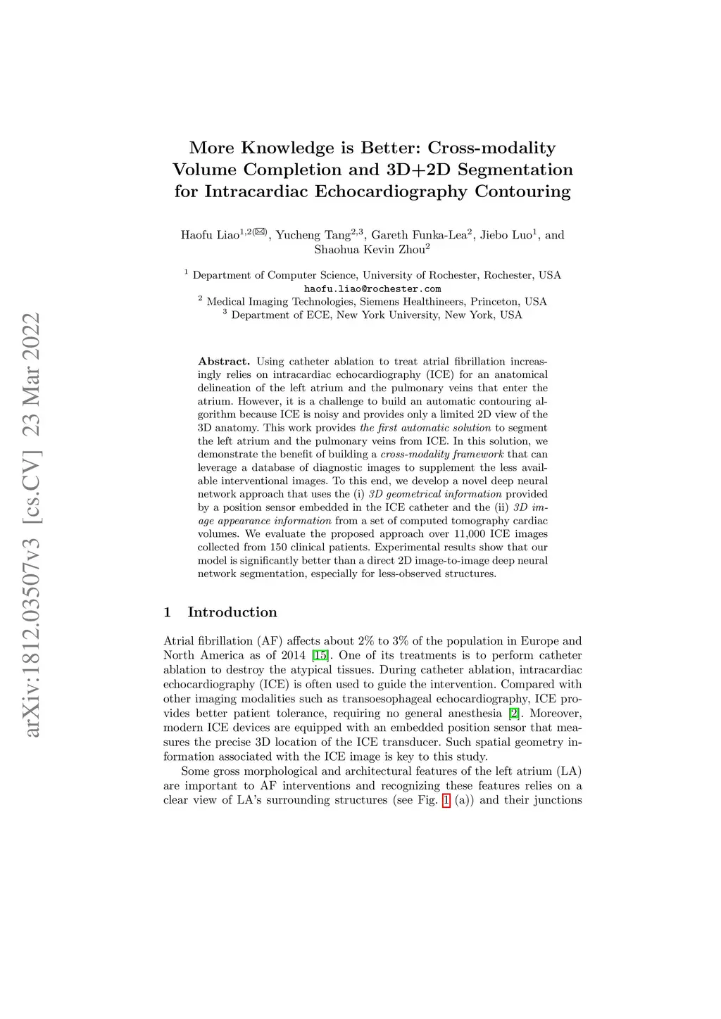Using catheter ablation to treat atrial fibrillation increasingly relies on intracardiac echocardiography (ICE) for an anatomical delineation of the left atrium and the pulmonary veins that enter the atrium. However, it is a challenge to build an automatic contouring algorithm because ICE is noisy and provides only a limited 2D view of the 3D anatomy. This work provides the first automatic solution to segment the left atrium and the pulmonary veins from ICE. In this solution, we demonstrate the benefit of building a cross-modality framework that can leverage a database of diagnostic images to supplement the less available interventional images. To this end, we develop a novel deep neural network approach that uses the (i) 3D geometrical information provided by a position sensor embedded in the ICE catheter and the (ii) 3D image appearance information from a set of computed tomography cardiac volumes. We evaluate the proposed approach over 11,000 ICE images collected from 150 clinical patients. Experimental results show that our model is significantly better than a direct 2D image-to-image deep neural network segmentation, especially for less-observed structures.