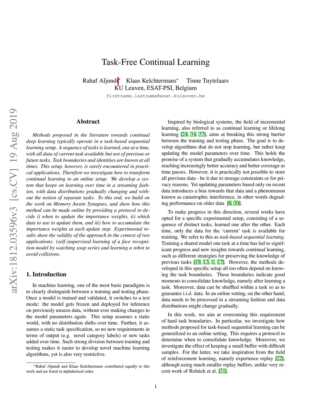 Methods proposed in the literature towards continual deep learning typically operate in a task-based sequential learning setup. A sequence of tasks is learned, one at a time, with all data of current task available but not of previous or future tasks. Task boundaries and identities are known at all times. This setup, however, is rarely encountered in practical applications. Therefore we investigate how to transform continual learning to an online setup. We develop a system that keeps on learning over time in a streaming fashion, with data distributions gradually changing and without the notion of separate tasks. To this end, we build on the work on Memory Aware Synapses, and show how this method can be made online by providing a protocol to decide i) when to update the importance weights, ii) which data to use to update them, and iii) how to accumulate the importance weights at each update step. Experimental results show the validity of the approach in the context of two applications: (self-)supervised learning of a face recognition model by watching soap series and learning a robot to avoid collisions.