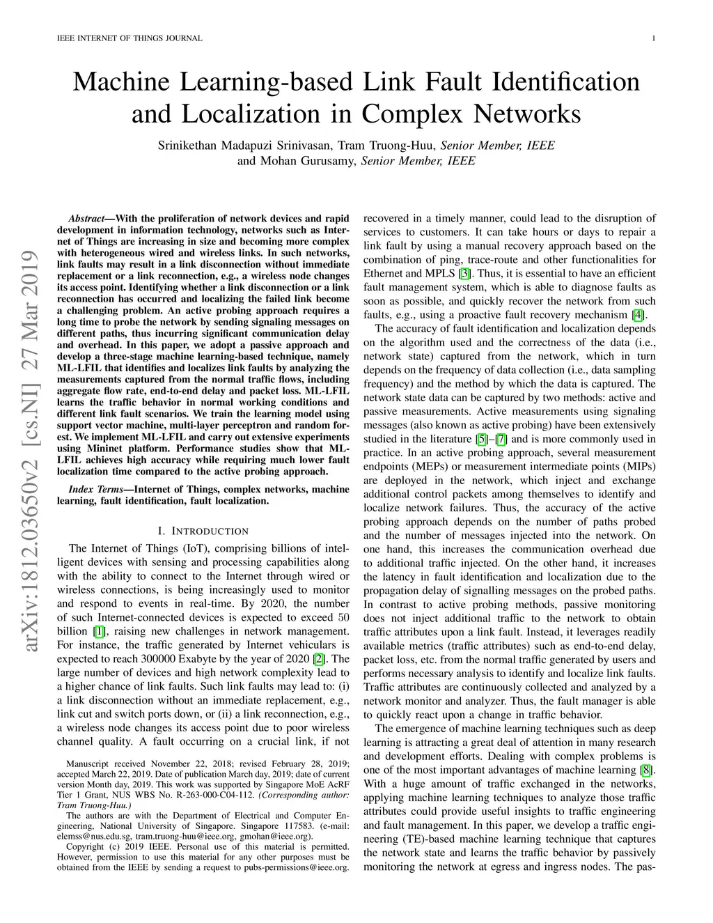 With the proliferation of network devices and rapid development in information technology, networks such as Internet of Things are increasing in size and becoming more complex with heterogeneous wired and wireless links. In such networks, link faults may result in a link disconnection without immediate replacement or a link reconnection, e.g., a wireless node changes its access point. Identifying whether a link disconnection or a link reconnection has occurred and localizing the failed link become a challenging problem. An active probing approach requires a long time to probe the network by sending signaling messages on different paths, thus incurring significant communication delay and overhead. In this paper, we adopt a passive approach and develop a three-stage machine learning-based technique, namely ML-LFIL that identifies and localizes link faults by analyzing the measurements captured from the normal traffic flows, including aggregate flow rate, end-to-end delay and packet loss. ML-LFIL learns the traffic behavior in normal working conditions and different link fault scenarios. We train the learning model using support vector machine, multi-layer perceptron and random forest. We implement ML-LFIL and carry out extensive experiments using Mininet platform. Performance studies show that ML-LFIL achieves high accuracy while requiring much lower fault localization time compared to the active probing approach.