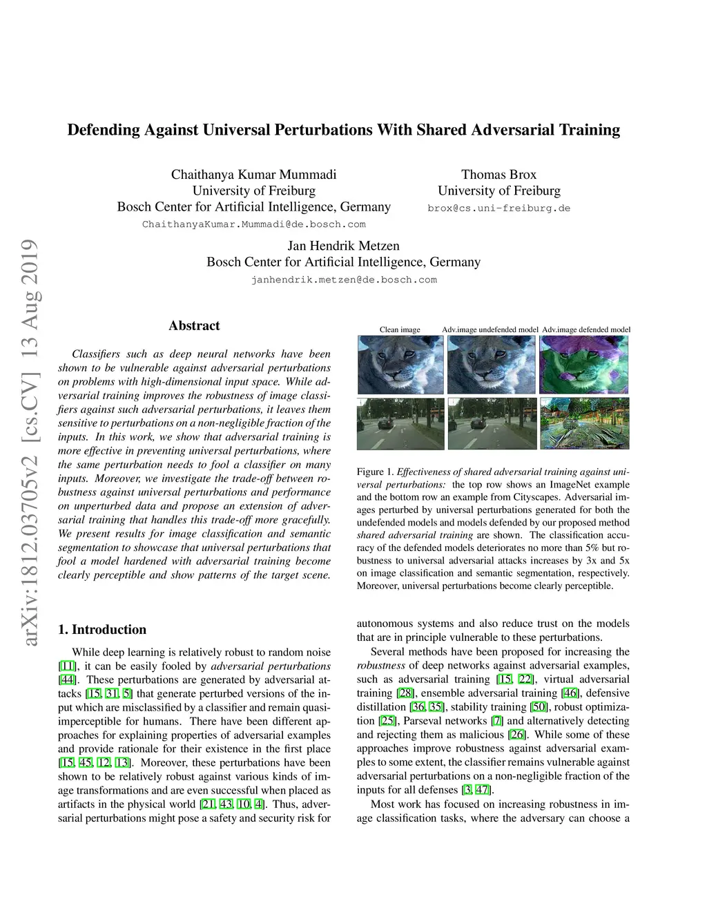 Classifiers such as deep neural networks have been shown to be vulnerable against adversarial perturbations on problems with high-dimensional input space. While adversarial training improves the robustness of image classifiers against such adversarial perturbations, it leaves them sensitive to perturbations on a non-negligible fraction of the inputs. In this work, we show that adversarial training is more effective in preventing universal perturbations, where the same perturbation needs to fool a classifier on many inputs. Moreover, we investigate the trade-off between robustness against universal perturbations and performance on unperturbed data and propose an extension of adversarial training that handles this trade-off more gracefully. We present results for image classification and semantic segmentation to showcase that universal perturbations that fool a model hardened with adversarial training become clearly perceptible and show patterns of the target scene.