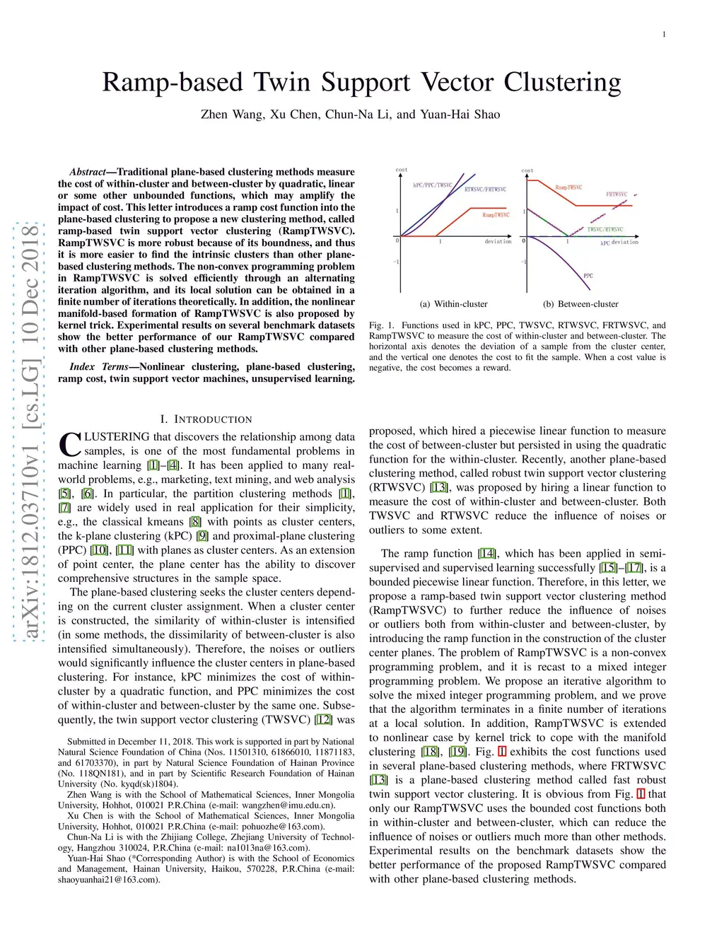 Traditional plane-based clustering methods measure the cost of within-cluster and between-cluster by quadratic, linear or some other unbounded functions, which may amplify the impact of cost. This letter introduces a ramp cost function into the plane-based clustering to propose a new clustering method, called ramp-based twin support vector clustering (RampTWSVC). RampTWSVC is more robust because of its boundness, and thus it is more easier to find the intrinsic clusters than other plane-based clustering methods. The non-convex programming problem in RampTWSVC is solved efficiently through an alternating iteration algorithm, and its local solution can be obtained in a finite number of iterations theoretically. In addition, the nonlinear manifold-based formation of RampTWSVC is also proposed by kernel trick. Experimental results on several benchmark datasets show the better performance of our RampTWSVC compared with other plane-based clustering methods.