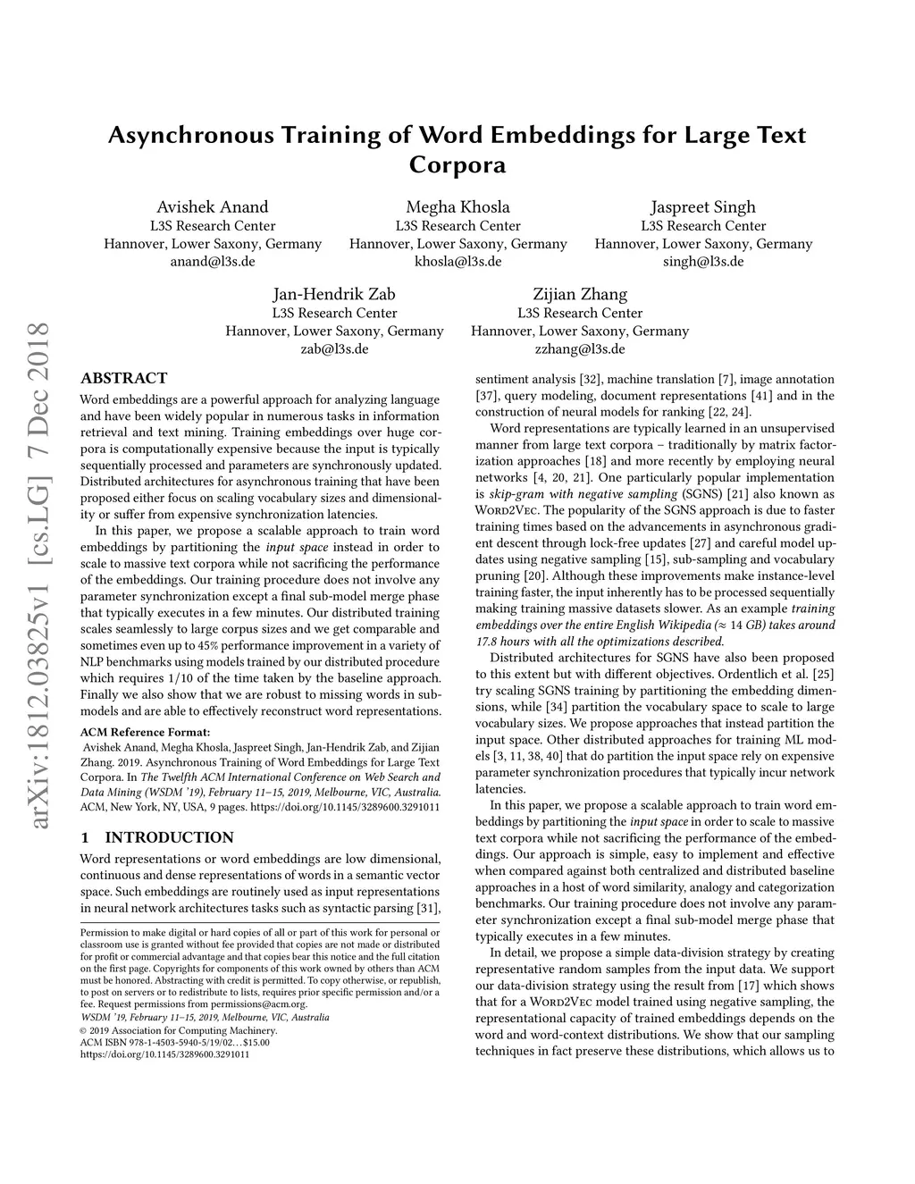 Asynchronous Training of Word Embeddings for Large Text Corpora