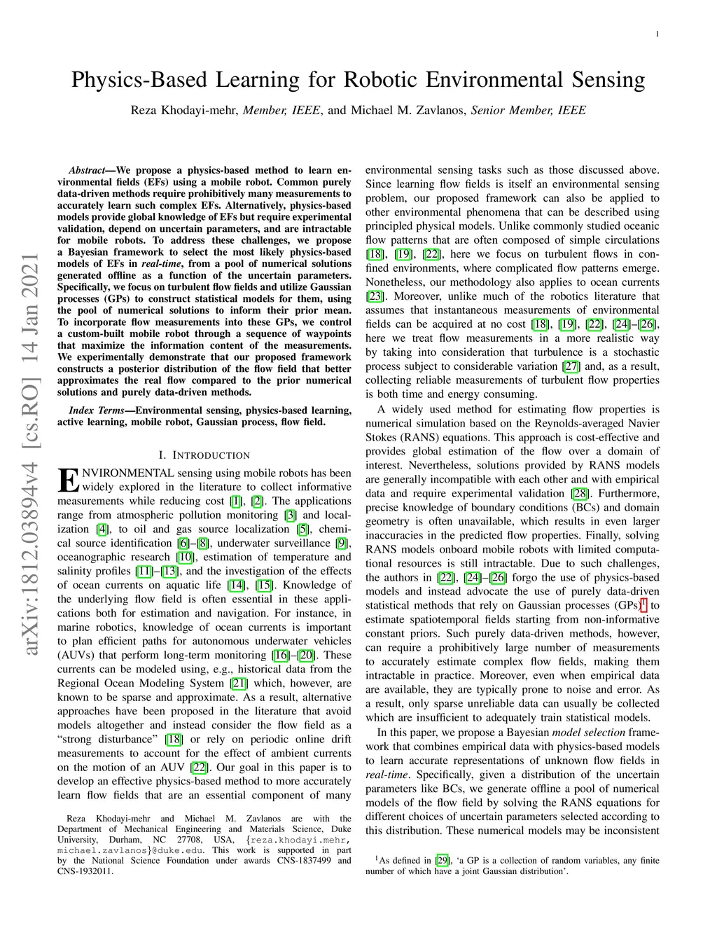 We propose a physics-based method to learn environmental fields (EFs) using a mobile robot. Common purely data-driven methods require prohibitively many measurements to accurately learn such complex EFs. Alternatively, physics-based models provide global knowledge of EFs but require experimental validation, depend on uncertain parameters, and are intractable for mobile robots. To address these challenges, we propose a Bayesian framework to select the most likely physics-based models of EFs in real-time, from a pool of numerical solutions generated offline as a function of the uncertain parameters. Specifically, we focus on turbulent flow fields and utilize Gaussian processes (GPs) to construct statistical models for them, using the pool of numerical solutions to inform their prior mean. To incorporate flow measurements into these GPs, we control a custom-built mobile robot through a sequence of waypoints that maximize the information content of the measurements. We experimentally demonstrate that our proposed framework constructs a posterior distribution of the flow field that better approximates the real flow compared to the prior numerical solutions and purely data-driven methods.