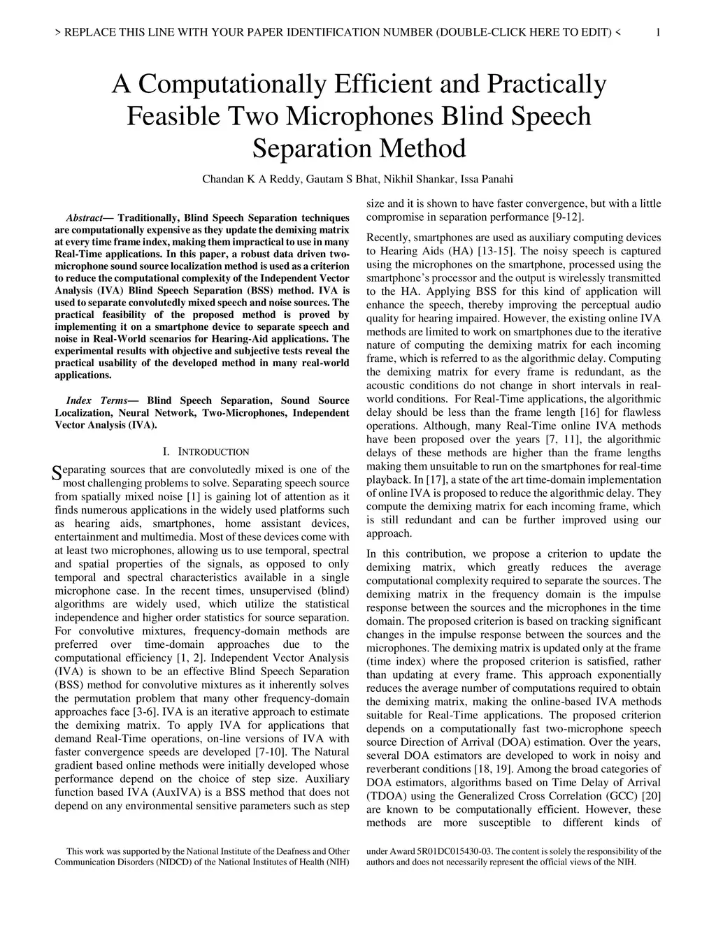 Traditionally, Blind Speech Separation techniques are computationally expensive as they update the demixing matrix at every time frame index, making them impractical to use in many Real-Time applications. In this paper, a robust data-driven two-microphone sound source localization method is used as a criterion to reduce the computational complexity of the Independent Vector Analysis (IVA) Blind Speech Separation (BSS) method. IVA is used to separate convolutedly mixed speech and noise sources. The practical feasibility of the proposed method is proved by implementing it on a smartphone device to separate speech and noise in Real-World scenarios for Hearing-Aid applications. The experimental results with objective and subjective tests reveal the practical usability of the developed method in many real-world applications.