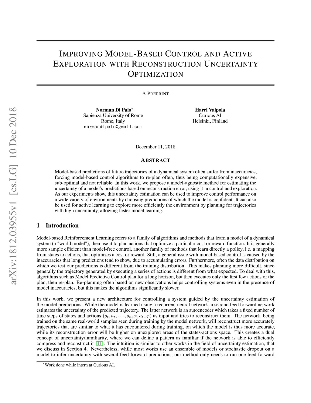 Model based predictions of future trajectories of a dynamical system often suffer from inaccuracies, forcing model based control algorithms to re-plan often, thus being computationally expensive, suboptimal and not reliable. In this work, we propose a model agnostic method for estimating the uncertainty of a model?s predictions based on reconstruction error, using it in control and exploration. As our experiments show, this uncertainty estimation can be used to improve control performance on a wide variety of environments by choosing predictions of which the model is confident. It can also be used for active learning to explore more efficiently the environment by planning for trajectories with high uncertainty, allowing faster model learning.