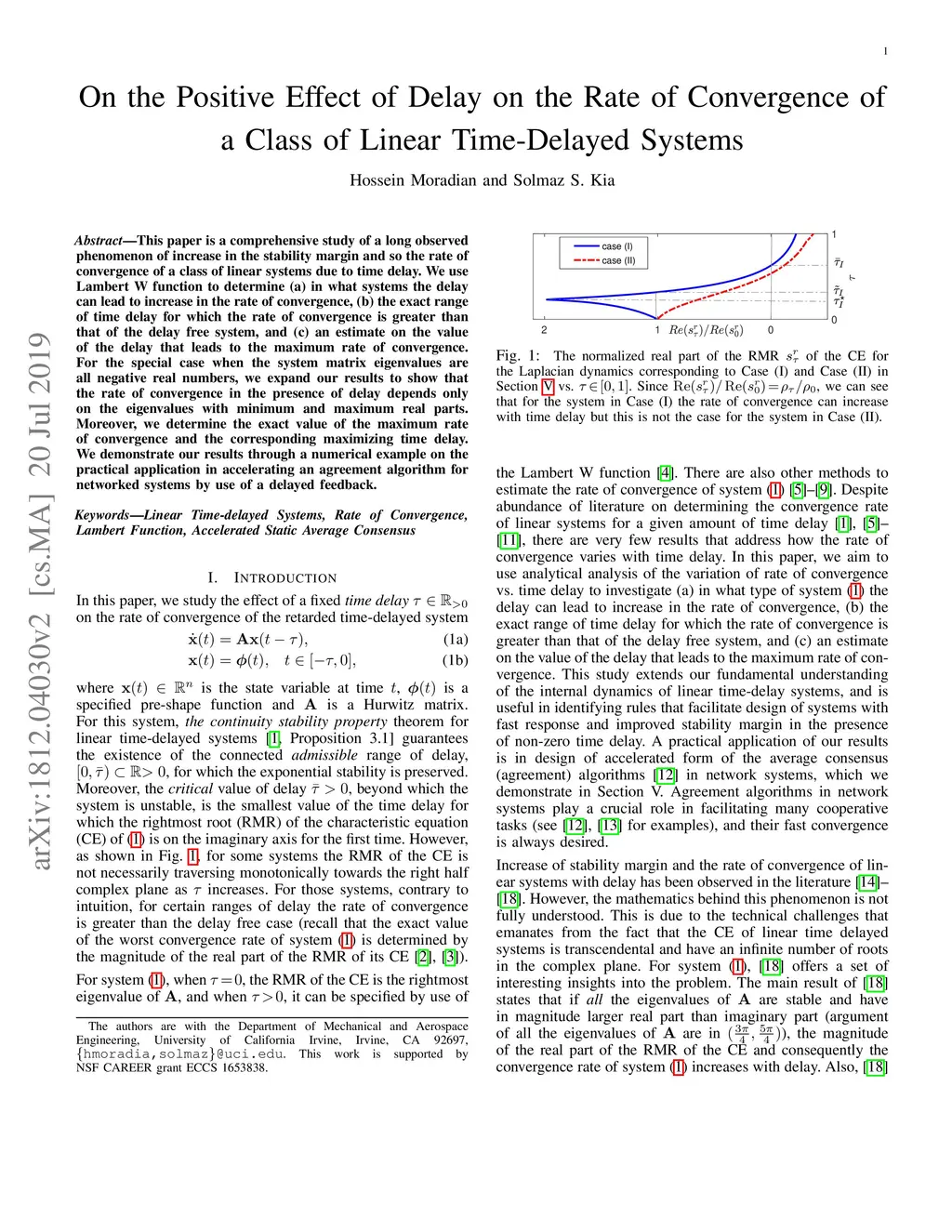 This paper is a comprehensive study of a long observed phenomenon of increase in the stability margin and so the rate of convergence of a class of linear systems due to time delay. We use Lambert W function to determine (a) in what systems the delay can lead to increase in the rate of convergence, (b) the exact range of time delay for which the rate of convergence is greater than that of the delay free system, and (c) an estimate on the value of the delay that leads to the maximum rate of convergence. For the special case when the system matrix eigenvalues are all negative real numbers, we expand our results to show that the rate of convergence in the presence of delay depends only on the eigenvalues with minimum and maximum real parts. Moreover, we determine the exact value of the maximum rate of convergence and the corresponding maximizing time delay. We demonstrate our results through a numerical example on the practical application in accelerating an agreement algorithm for networked~systems by use of a delayed feedback.