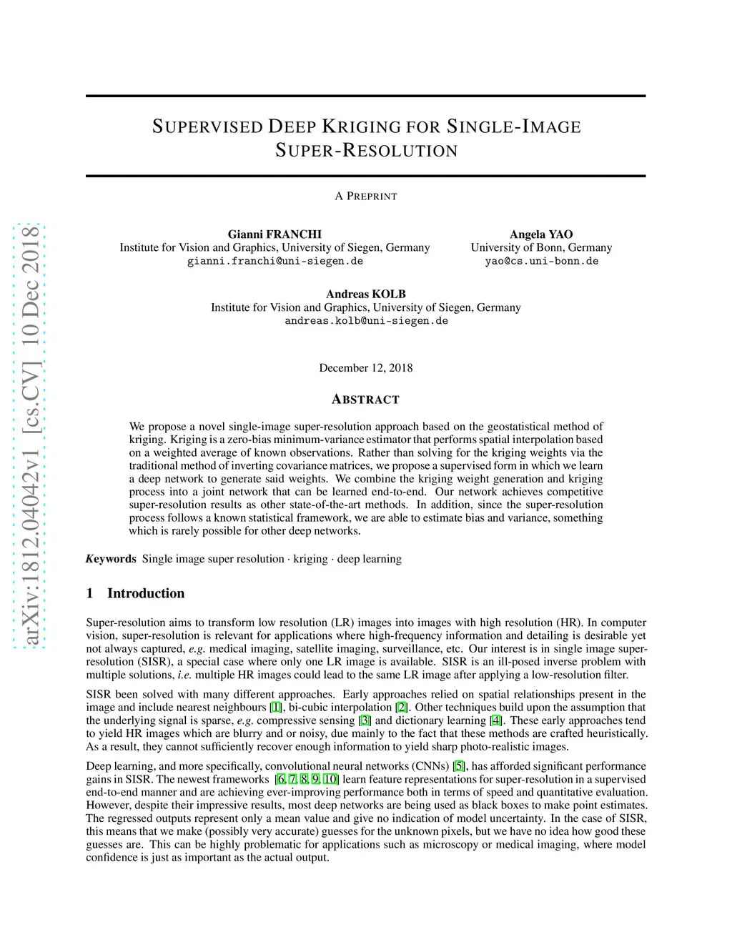 Supervised Deep Kriging for Single-Image Super-Resolution