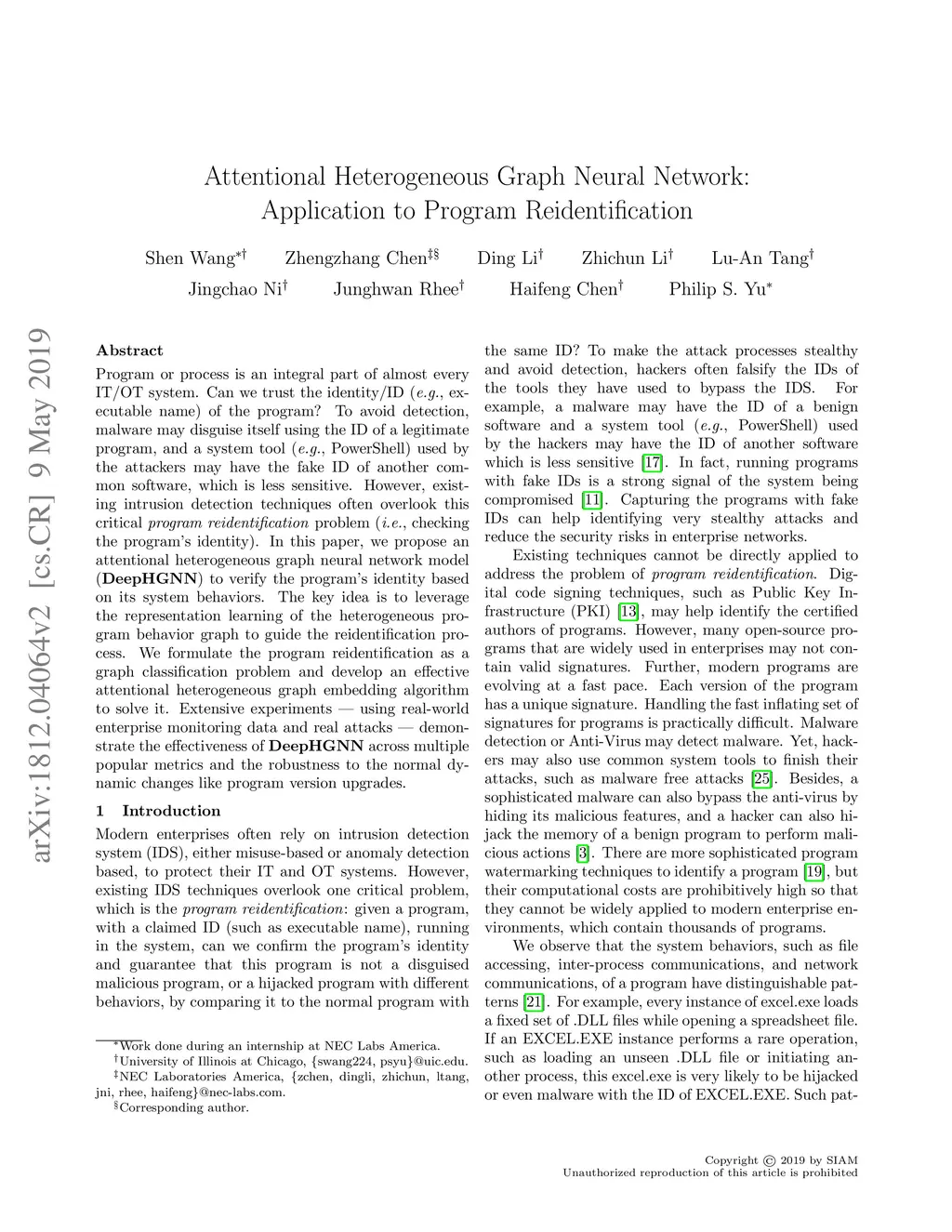 Program or process is an integral part of almost every IT/OT system. Can we trust the identity/ID (e.g., executable name) of the program? To avoid detection, malware may disguise itself using the ID of a legitimate program, and a system tool (e.g., PowerShell) used by the attackers may have the fake ID of another common software, which is less sensitive. However, existing intrusion detection techniques often overlook this critical program reidentification problem (i.e., checking the program's identity). In this paper, we propose an attentional heterogeneous graph neural network model (DeepHGNN) to verify the program's identity based on its system behaviors. The key idea is to leverage the representation learning of the heterogeneous program behavior graph to guide the reidentification process. We formulate the program reidentification as a graph classification problem and develop an effective attentional heterogeneous graph embedding algorithm to solve it. Extensive experiments --- using real-world enterprise monitoring data and real attacks --- demonstrate the effectiveness of DeepHGNN across multiple popular metrics and the robustness to the normal dynamic changes like program version upgrades.