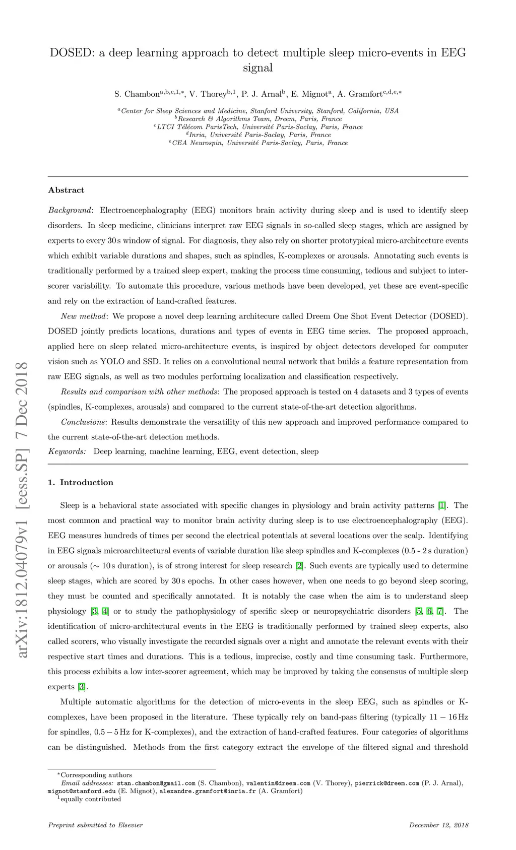 Background: Electroencephalography (EEG) monitors brain activity during sleep and is used to identify sleep disorders. In sleep medicine, clinicians interpret raw EEG signals in so-called sleep stages, which are assigned by experts to every 30s window of signal. For diagnosis, they also rely on shorter prototypical micro-architecture events which exhibit variable durations and shapes, such as spindles, K-complexes or arousals. Annotating such events is traditionally performed by a trained sleep expert, making the process time consuming, tedious and subject to inter-scorer variability. To automate this procedure, various methods have been developed, yet these are event-specific and rely on the extraction of hand-crafted features. New method: We propose a novel deep learning architecure called Dreem One Shot Event Detector (DOSED). DOSED jointly predicts locations, durations and types of events in EEG time series. The proposed approach, applied here on sleep related micro-architecture events, is inspired by object detectors developed for computer vision such as YOLO and SSD. It relies on a convolutional neural network that builds a feature representation from raw EEG signals, as well as two modules performing localization and classification respectively. Results and comparison with other methods: The proposed approach is tested on 4 datasets and 3 types of events (spindles, K-complexes, arousals) and compared to the current state-of-the-art detection algorithms. Conclusions: Results demonstrate the versatility of this new approach and improved performance compared to the current state-of-the-art detection methods.